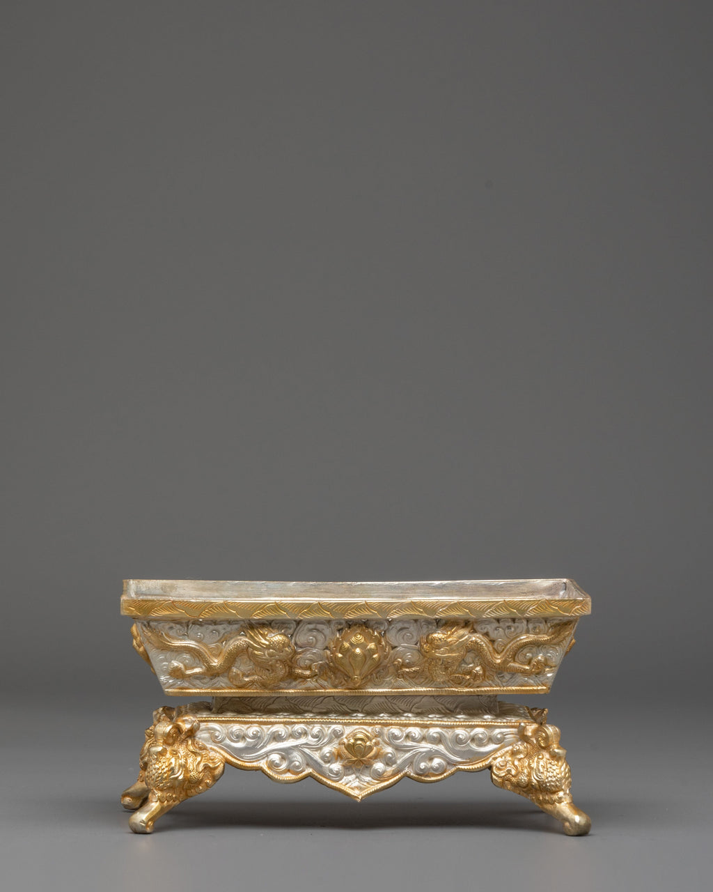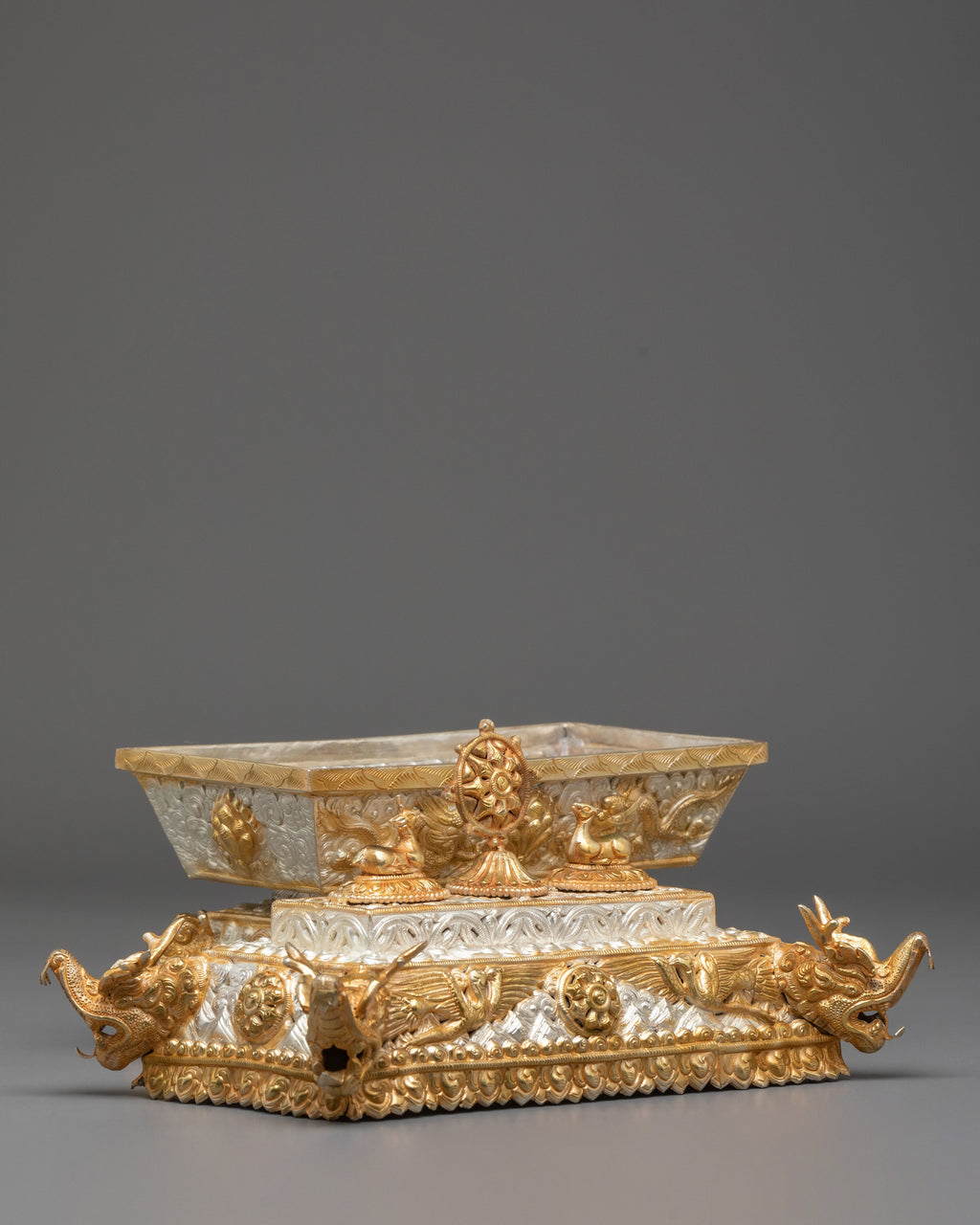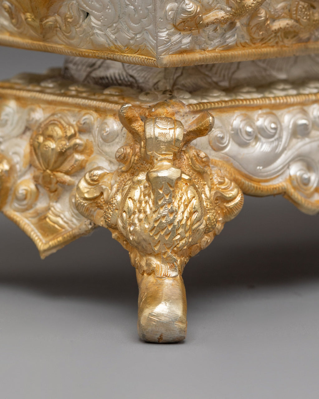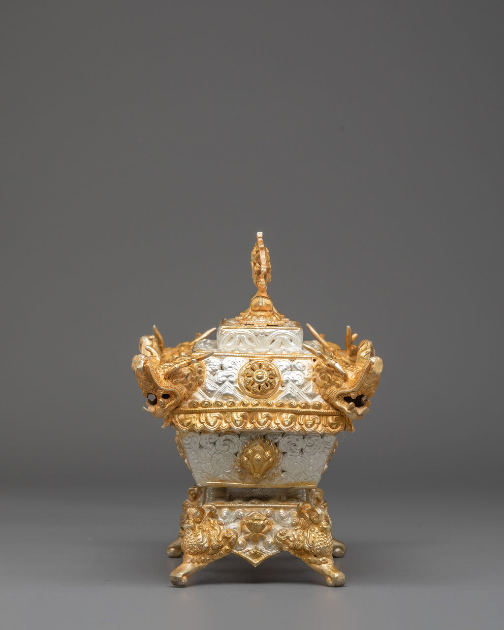 The burner's silver electro plated designs offer spiritual meanings such as protection, harmony, and wealth. The gold-plated and silver plated accents represent spiritual ascending. Each piece is carefully designed to enhance your rituals and bring positive energy into your environment. This incense burner is a work of sacred art intended for those who want to connect profoundly with their spiritual practices.