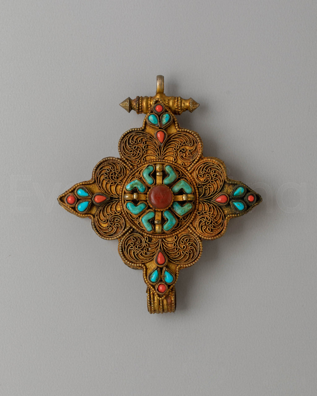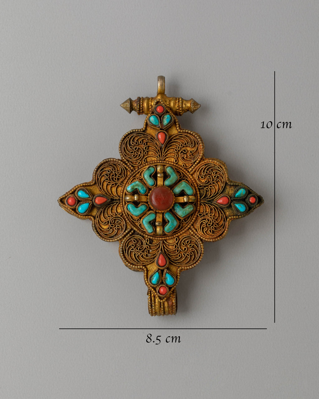 The Sacred Ghau Box Locket is not just a beautiful accessory but also a spiritual tool that can be used for meditation, prayer, or as a protective charm. Whether worn as a pendant or kept on your Buddhist altar, this locket connects you with the sacred energy of the universe, while also offering a beautiful and meaningful decoration. The combination of gold, copper, and gemstones ensures that this handcrafted piece remains both spiritually significant and visually stunning, making it an ideal addition to any collection.