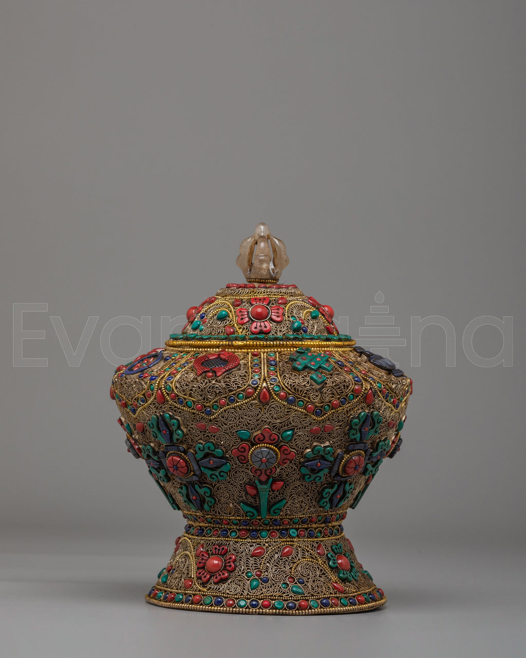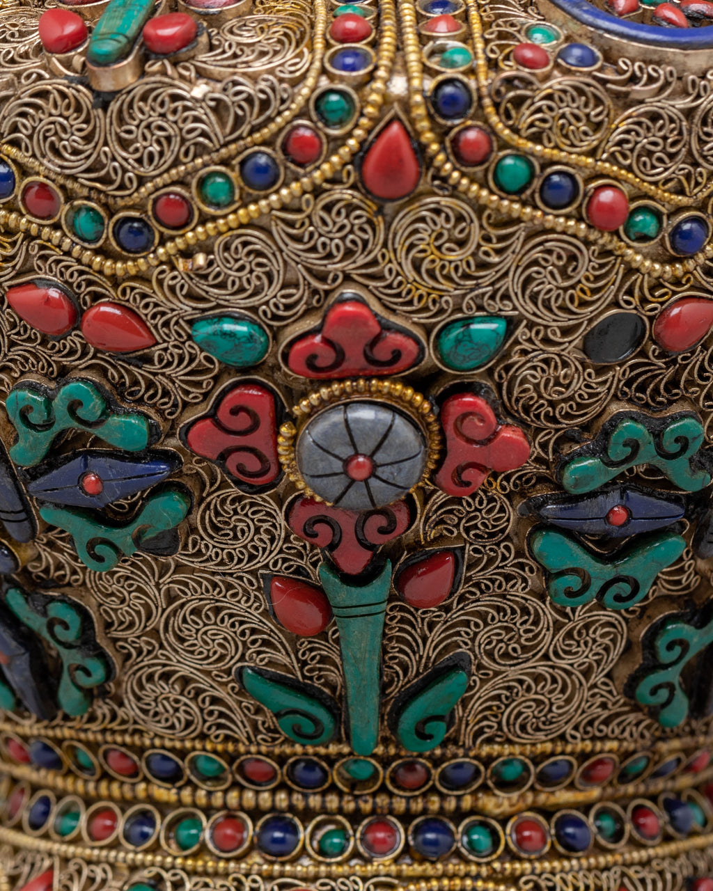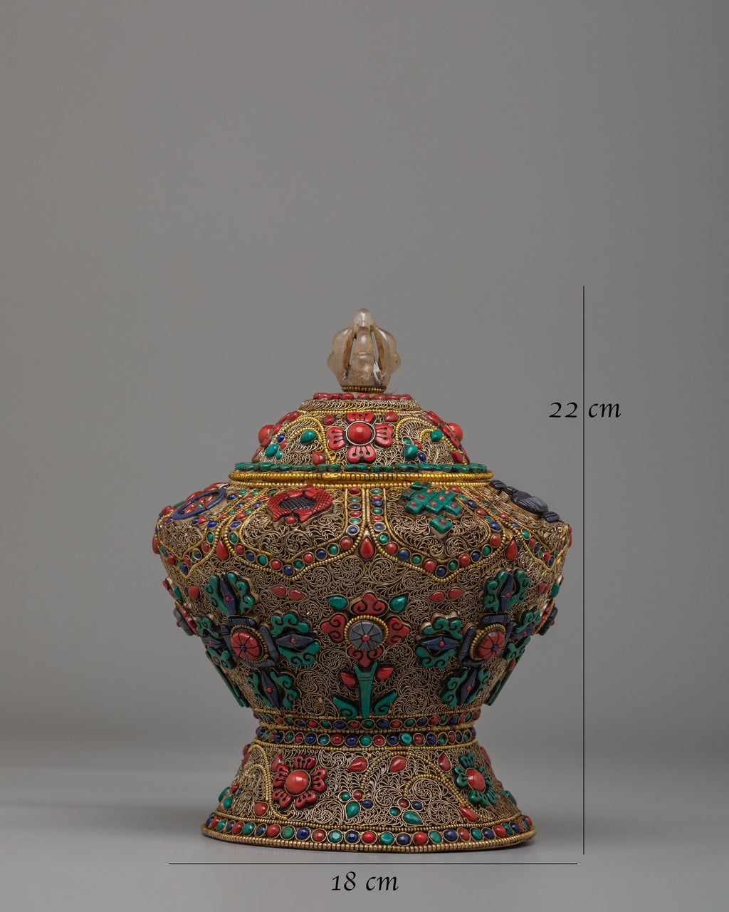 The design of the rice pot is imbued with deep cultural and spiritual significance. The filigree work represents the interconnectedness of all beings, creating a delicate pattern that speaks to the balance of the universe. The gemstones, placed with precision, reflect various aspects of Tibetan Buddhist teachings. Coral, turquoise, and lapis lazuli not only enhance the pot's beauty but also elevate its spiritual energy, making it a powerful addition to any sacred space or altar.