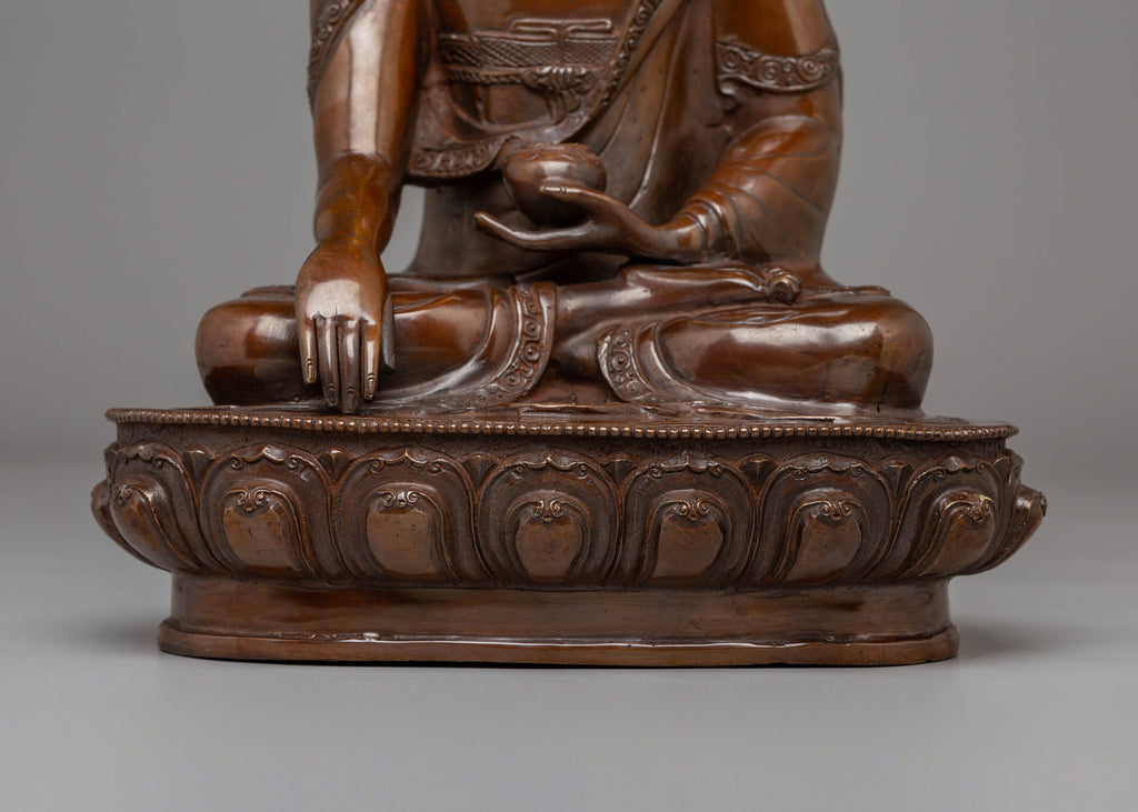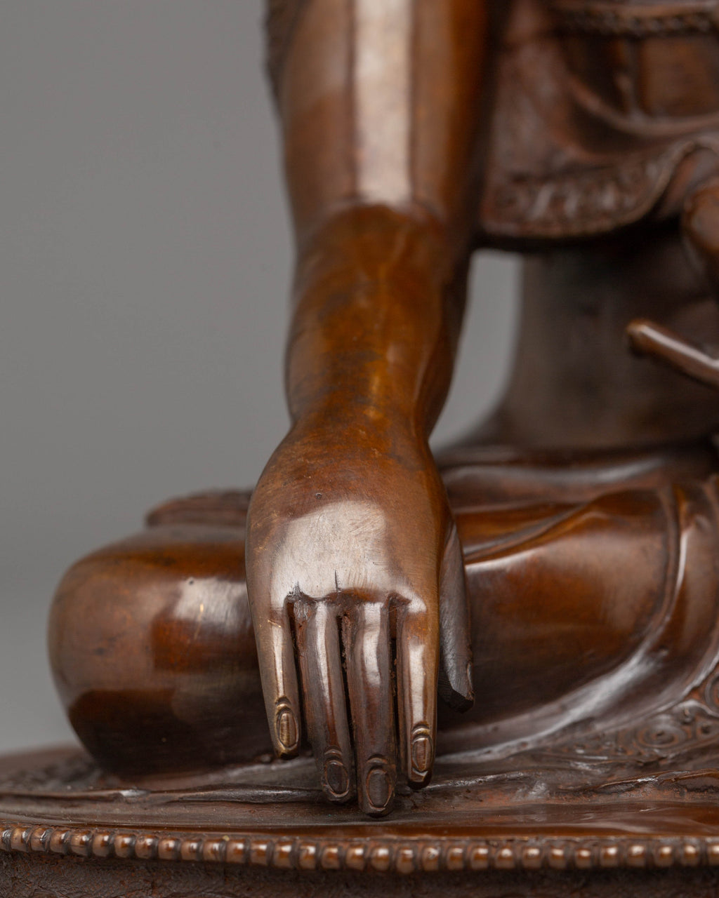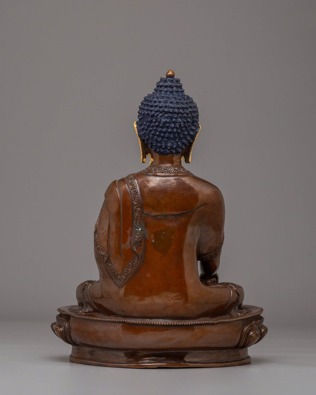 The Buddha Shakyamuni sculpture depicts the Buddha seated in the classic lotus position, a pose representing meditation, balance, and spiritual awakening. The intricate gold plating highlights the crown and jewelry, accentuating the divine nature of the Buddha, while the oxidized copper body gives the statue a traditional and earthy finish. The acrylic colors enhance the face and fine details, making it visually striking while also imparting a sense of peace and serenity. This fusion of materials creates a harmonious balance between the earthly and divine aspects of the Buddha’s teachings.