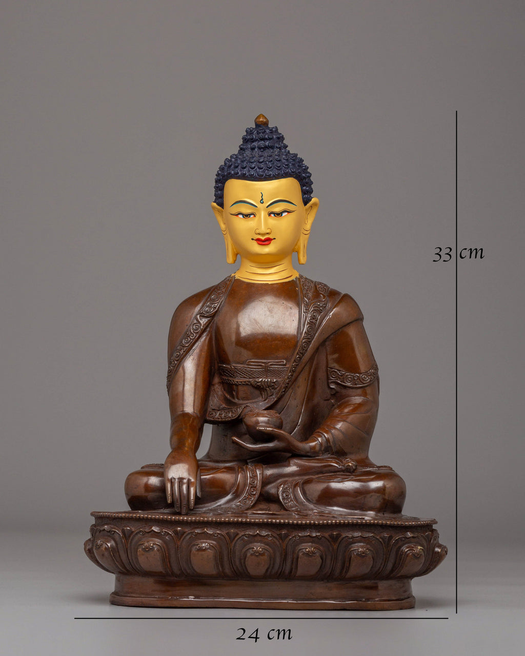 The Handcrafted Sculpture of Buddha Shakyamuni is a stunning piece of art that embodies the peaceful and enlightened qualities of the historical Buddha. Standing at 33 cm in height and 24 cm in width, weighing 3.93 kg, this statue is expertly crafted from oxidized copper and gold-plated, and enhanced with acrylic colors. The statue captures the serene presence of Shakyamuni Buddha, making it a perfect centerpiece for your Buddhist altar, meditation space, or sacred area, symbolizing wisdom, tranquility, and enlightenment.