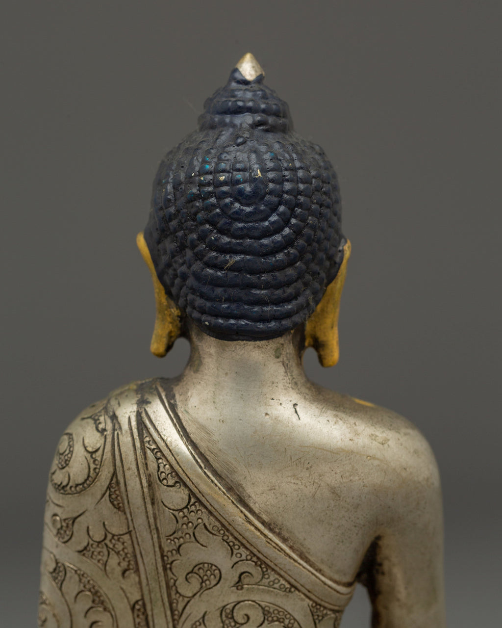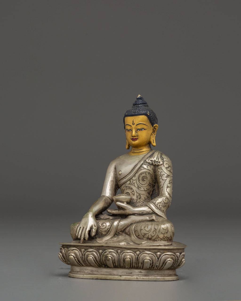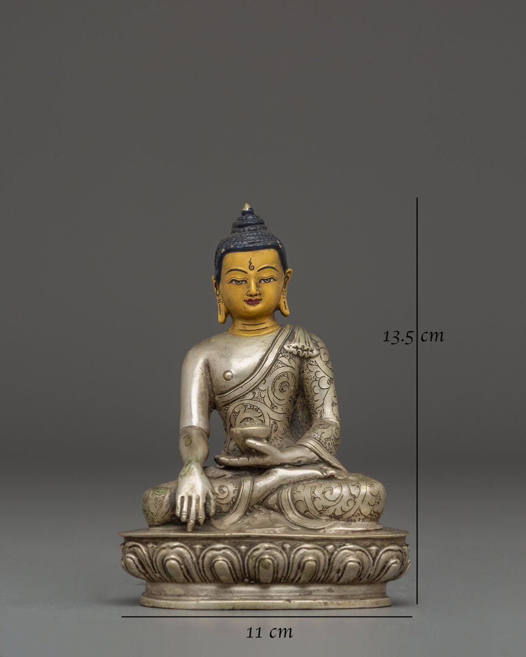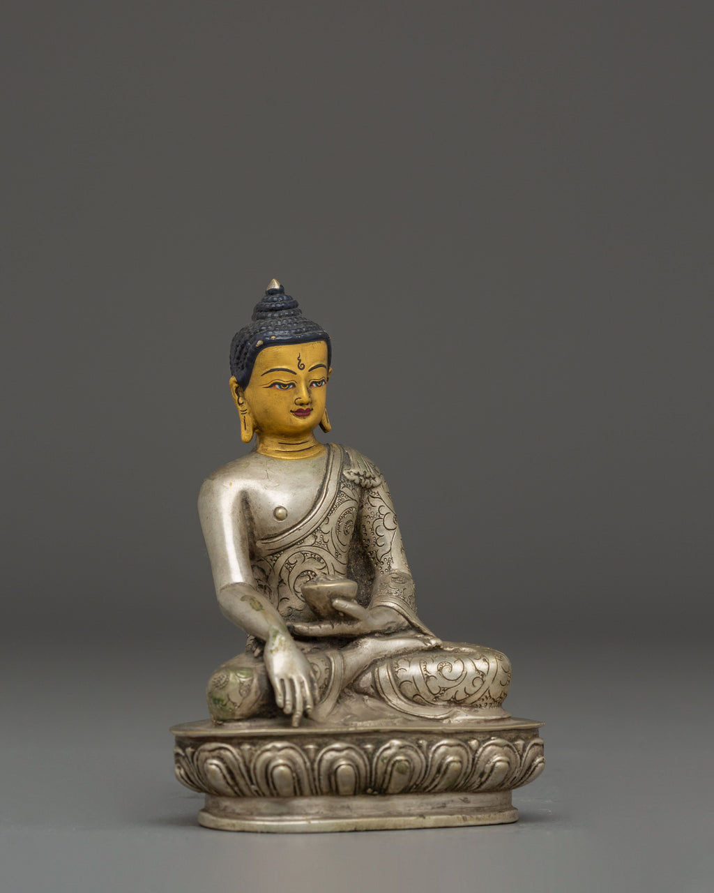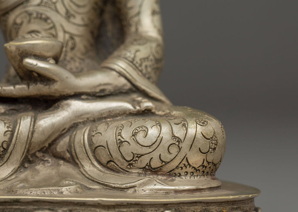 The silver finish accentuates the intricate craftsmanship of the artisans, highlighting every delicate feature—from the folds of the robe to the serene expression on the Buddha’s face. The silver plating symbolizes purity, clarity, and spiritual illumination, while the copper core represents stability and grounding energy. Together, they harmonize the material and spiritual realms, making this statue both aesthetically stunning and spiritually uplifting. Each detail reflects the mastery of traditional Himalayan metalwork, where devotion and artistry unite seamlessly.