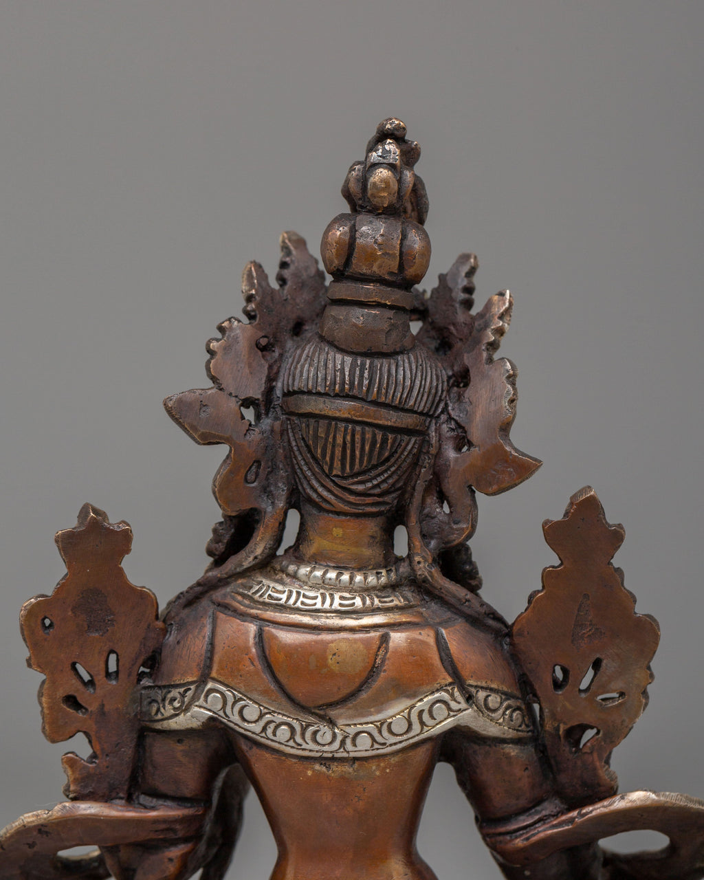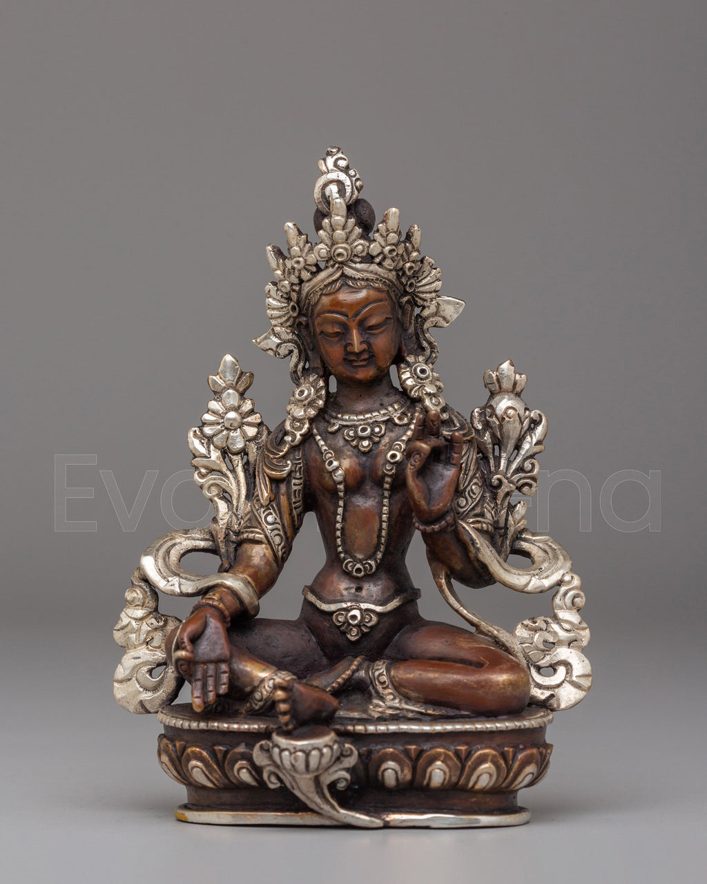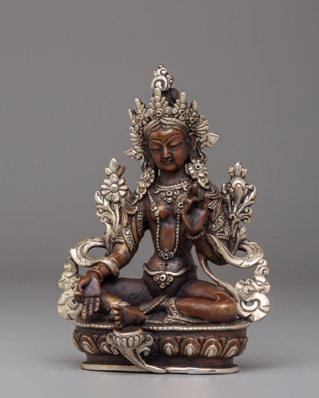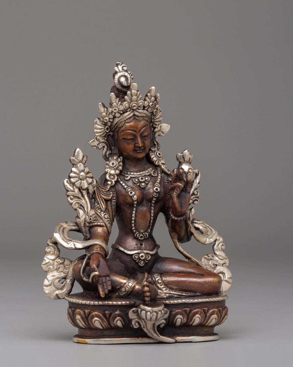 Green Tara is a highly regarded deity in Tibetan Buddhism. She represents protection and enlightenment, encouraging followers to practice compassion and overcome challenges on their spiritual journey. Placed on an altar or shown in a hallowed area, this handcrafted monument is a sacred symbol of celestial direction and blessing.Seated gracefully, her right leg extended, she emanates tranquility and readiness to aid those in need. She holds a lotus flower in her right hand, symbolizing purity and spiritual awakening. Her left hand performs the Three Jewel Mudra, representing the Buddha, Dharma, and Sangha, while holding a lotus to signify spiritual growth. Adorned with a Five Dhyani Buddha crown, she embodies the five aspects of enlightened wisdom.