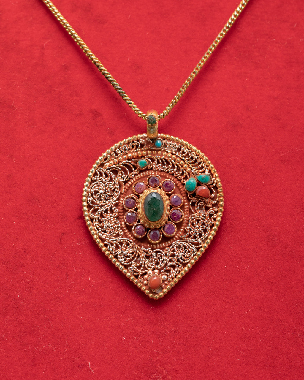 The Handcrafted Silver Locket with Gold Plating is a beautiful fusion of traditional artistry and luxury. The pendant is crafted from silver and coated with rich gold to give it an exquisite finish that stands out in any setting. Featuring a circle of artificial panna (emerald), ruby, coral, and turquoise stones, this piece brings a vibrant pop of color and elegance to any jewelry collection. The intricate design of this locket not only catches the eye but also holds symbolic meaning, representing prosperity, vitality, and balance.