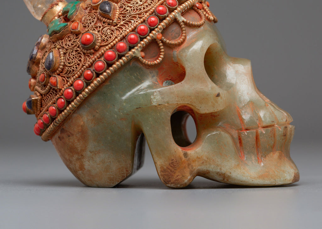 The crystal and copper body of the skull creates an eye-catching, luxurious finish, with the gold plating adding a touch of elegance and refinement. Turquoise and coral inlays further elevate its visual appeal and spiritual meaning, offering a balance of energy and tranquility. This sculpture is not only a statement piece for your home decor but also serves as a spiritual tool, inviting transformation, protection, and healing energy into your space. Whether placed on your altar, desk, or as a centerpiece in your living room, this Handcrafted Skull Sculpture is a captivating addition that blends artistry, symbolism, and divine energy.