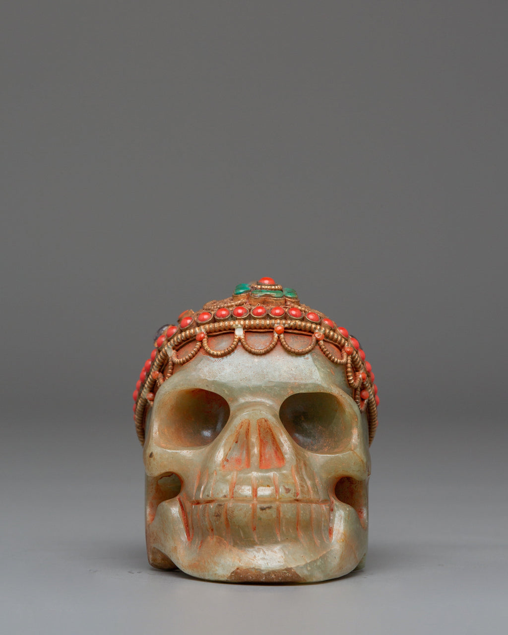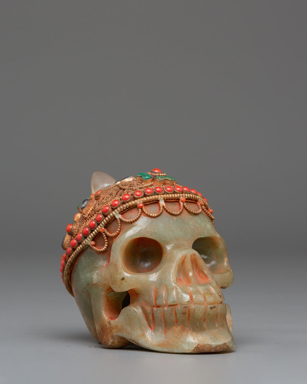 This Handcrafted Skull Sculpture is a stunning and unique piece that blends spiritual symbolism with exquisite craftsmanship. Standing at 10cm in height and 8cm in width, this sculpture is made from a combination of crystal and copper, enhanced with gold plating and adorned with turquoise and coral, two semi-precious stones known for their spiritual properties. The skull design, representing mortality and transformation, is meticulously carved and finished with vibrant, precious accents. The inclusion of turquoise symbolizes healing, while coral represents protection and vitality, making this sculpture a powerful emblem of life’s journey and spiritual evolution.