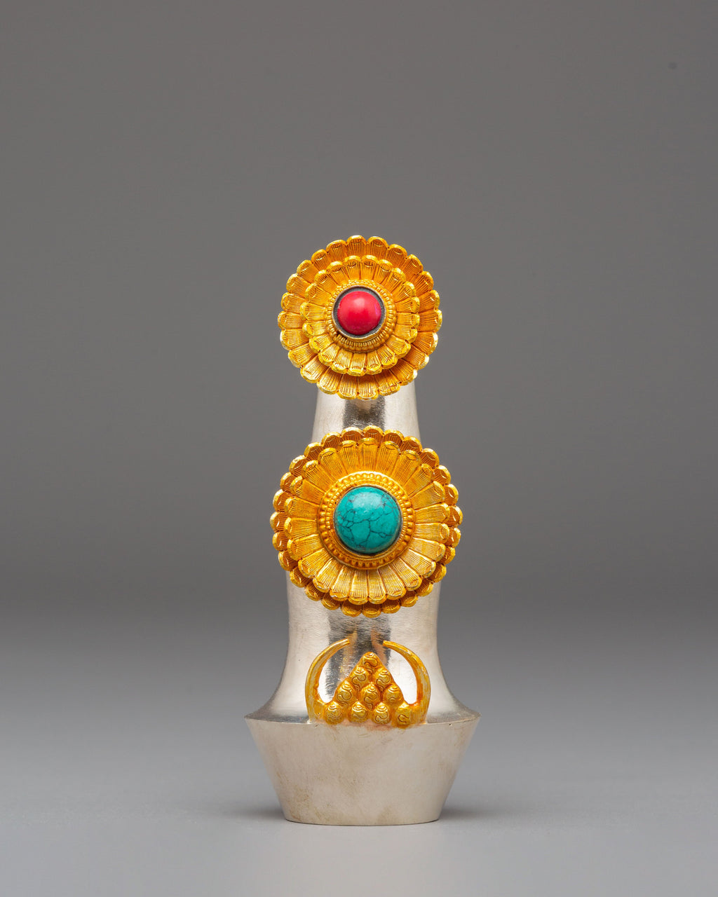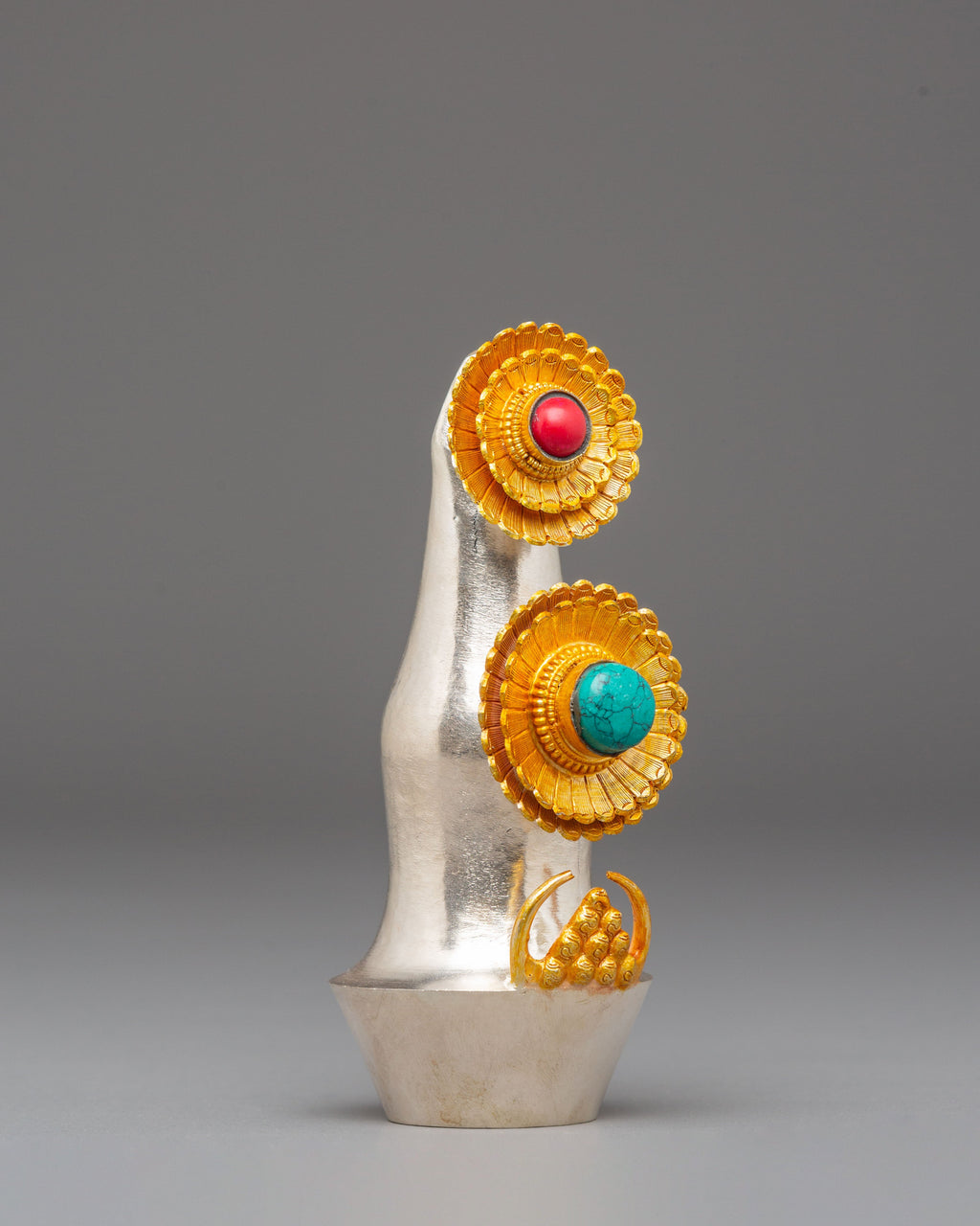 Ideal for practitioners, collectors, or anyone drawn to Tibetan ritual art, this Handcrafted Spiritual Torma embodies devotion and spiritual transformation. Whether used in daily offerings, ceremonial rituals, or as a meaningful decorative piece, it radiates blessings, intention, and spiritual clarity. Its combination of silver plating, gold-plated details, and sacred turquoise and coral accents makes it a captivating ritual tool that enriches your spiritual practice and deepens your connection to Tibetan Buddhist tradition.
