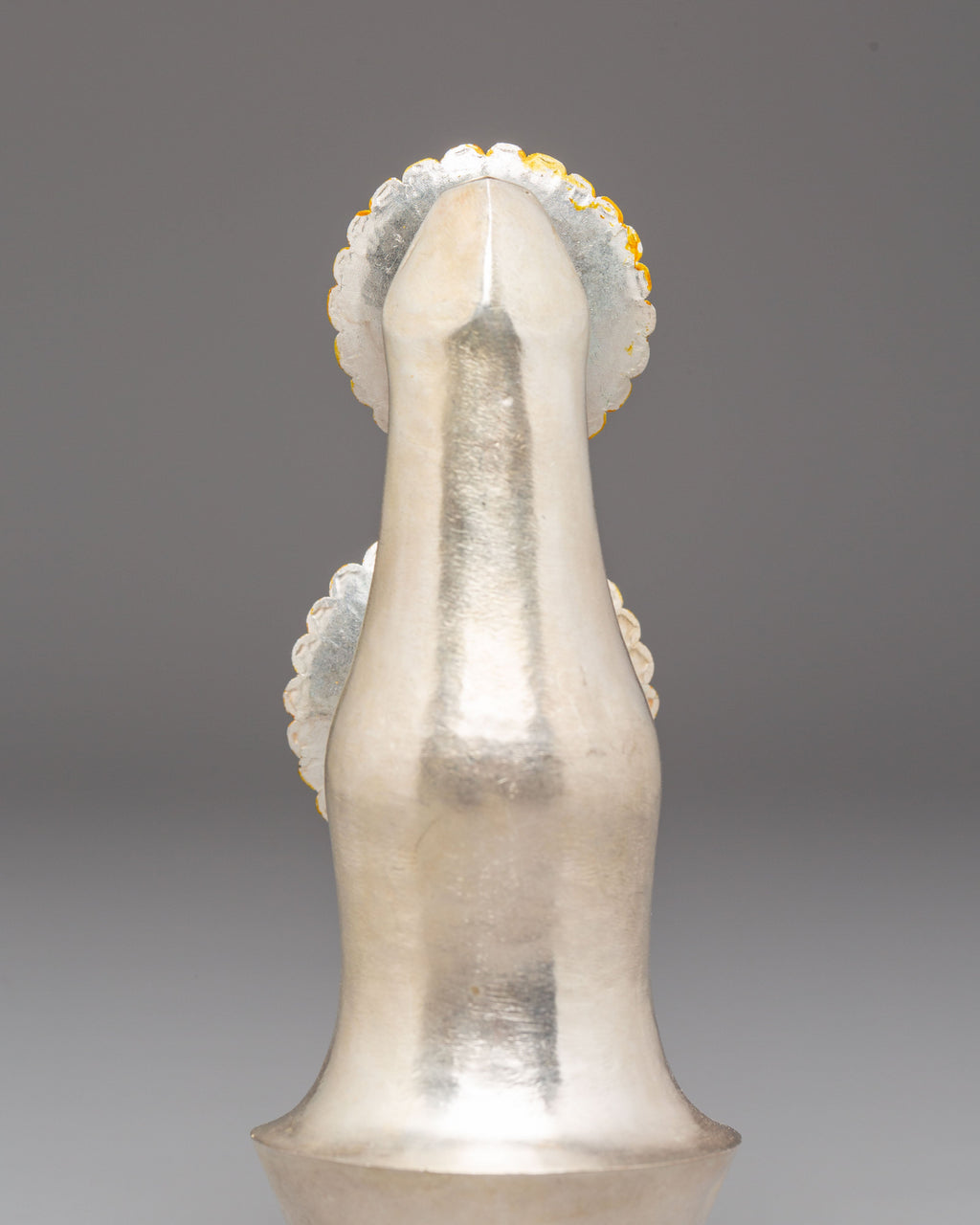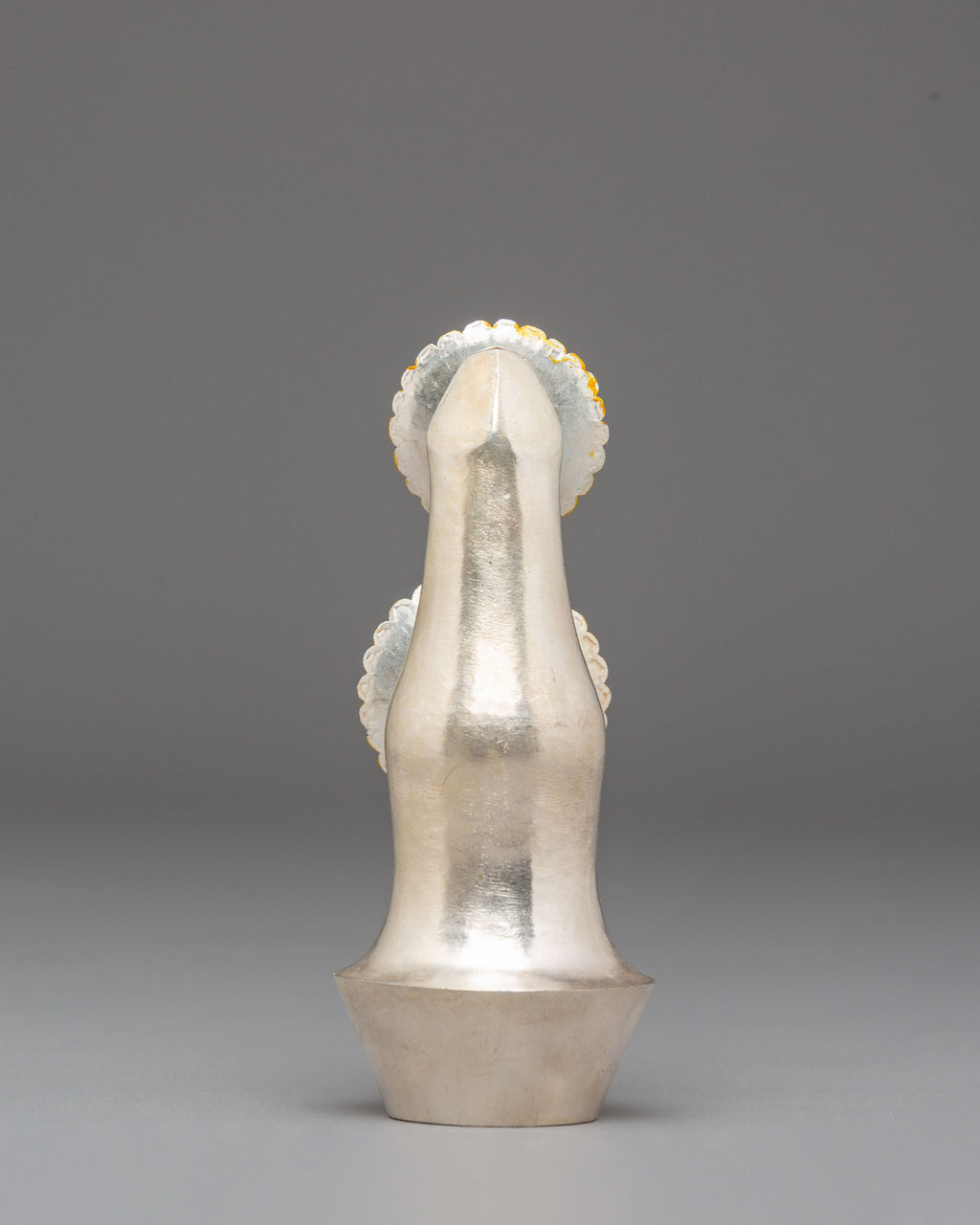 This Handcrafted Spiritual Torma is a beautifully crafted Tibetan ritual object used in sacred ceremonies, meditation practices, and traditional offerings. Standing at 13.5 cm in height and 6 cm in width, this torma features a copper body coated with silver plating and mercury gold plating, giving it a radiant presence. Tormas hold deep spiritual meaning in Tibetan Buddhism, symbolizing devotion, purification, and the offering of one’s intentions to enlightened beings.