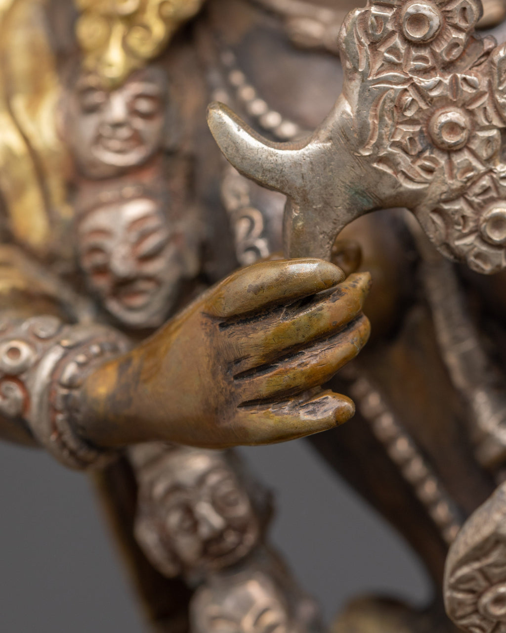 Kurkulla dances seductively with her right leg raised, treading upon a vanquished human form that represents both outer and inner obstacles. She has four arms and holds various weapons, indicating her powers to bewitch and ensnare the hearts of men and women. With two hands, she draws a bow made of flower garlands, and she prepares to shoot a beautiful arrow whose shaft is made of flowers and whose flight is made of leaves. Her other left hand holds a lasso, and her right hand holds a flower goad. They also symbolize her ability to favorably influence and incline the minds of others to aid and protect her followers.