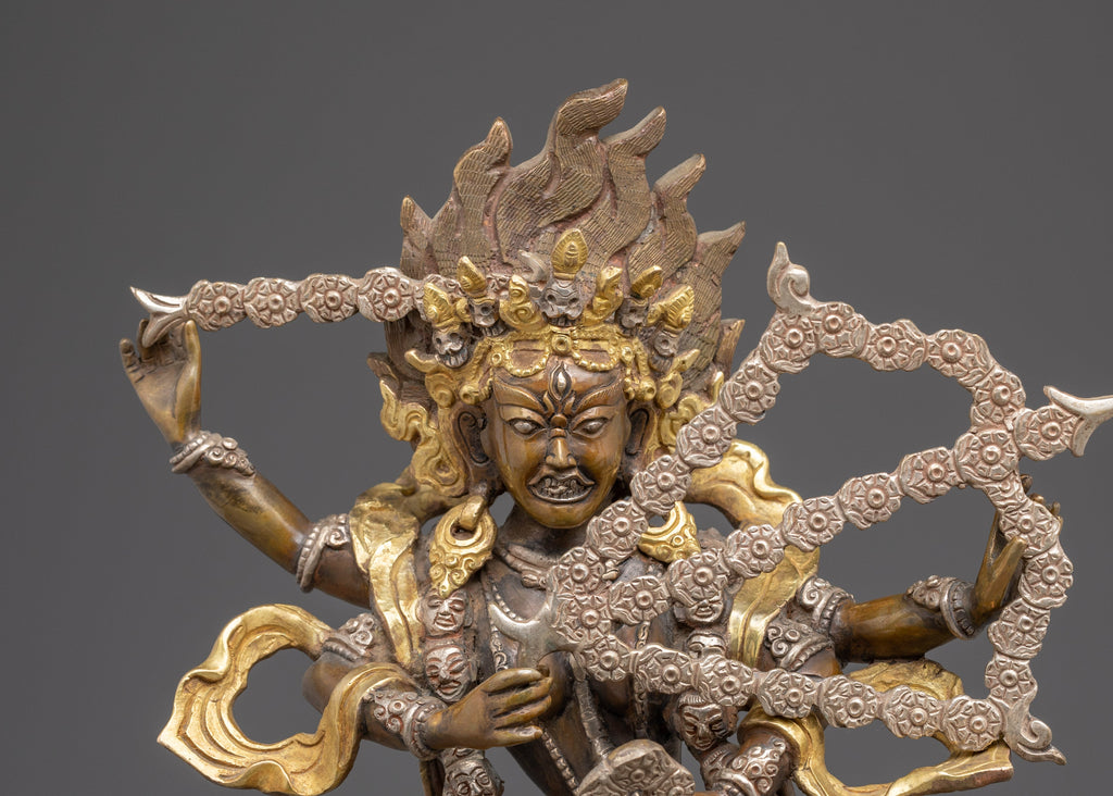 Kurukulla is depicted within a frame of dancing flames, representing the vibrant energy of compassion and wisdom that burns away ignorance. The intricate hand-painting highlights her celestial ornaments, lotus motifs, and bow made of flowers, symbolizing her ability to draw beings toward enlightenment. This sculpture beautifully captures the balance between spiritual magnetism and compassionate strength found in Tibetan Buddhist art.
