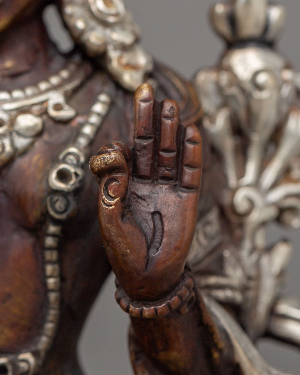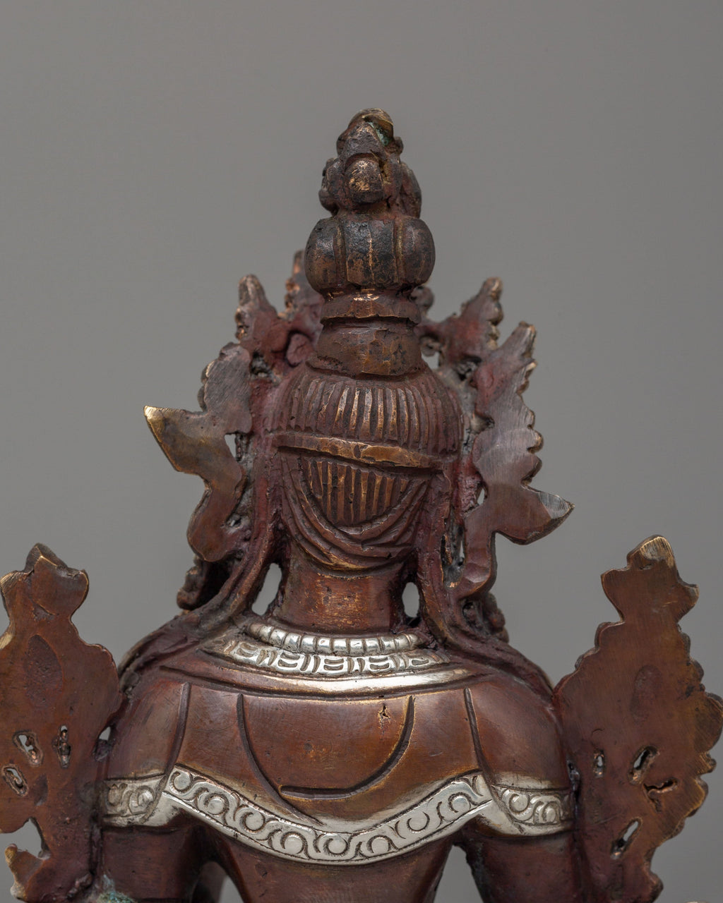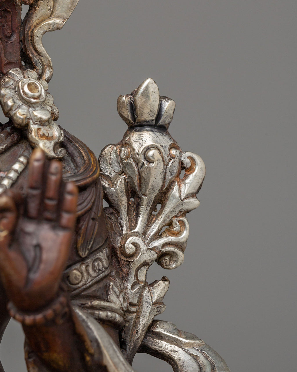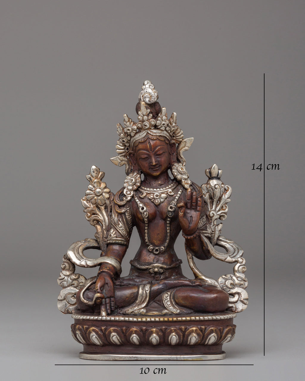 This handcrafted statue of White Tara is a beautiful representation of the Tibetan Buddhist goddess known for her compassion, healing, and protection. Standing 14 cm tall and 10 cm wide, this statue is made from oxidized copper and electro-silver-plated for a radiant finish. White Tara is revered as the goddess of longevity, compassion, and healing, making this statue an ideal addition to your meditation space or home altar.
