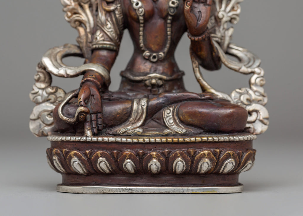 The statue depicts White Tara seated gracefully on a lotus base, symbolizing purity and spiritual awakening. Her seven eyes are intricately detailed, representing her vigilant and compassionate nature. The electro-silver plating enhances the intricate carvings on her robe, crown, and lotus pedestal, creating a divine aura. This statue not only adds a touch of sacred beauty to your home but also serves as a powerful reminder of White Tara's blessings for health, peace, and spiritual growth.