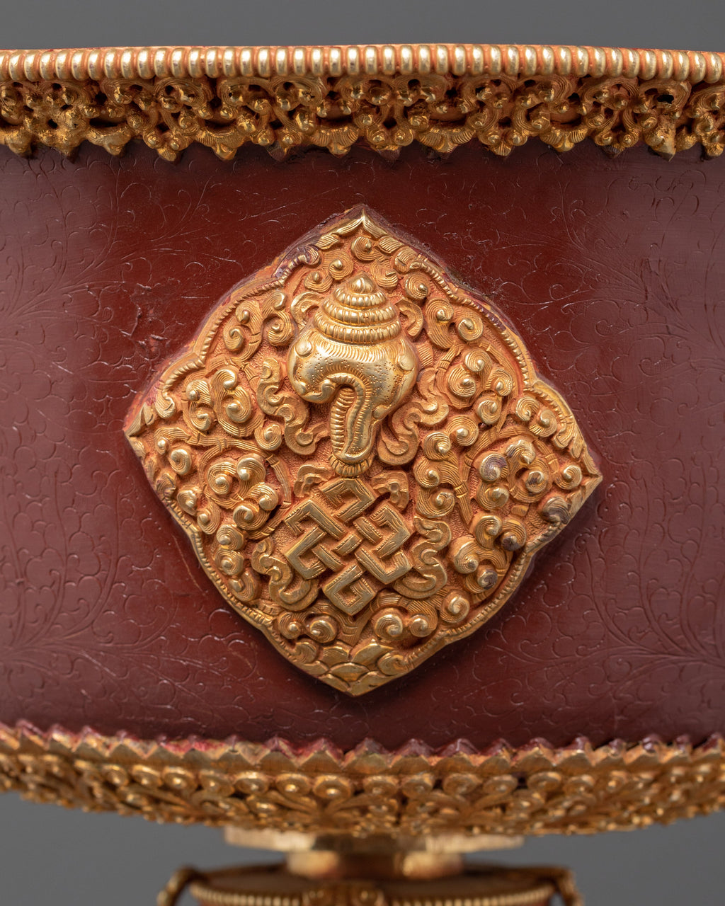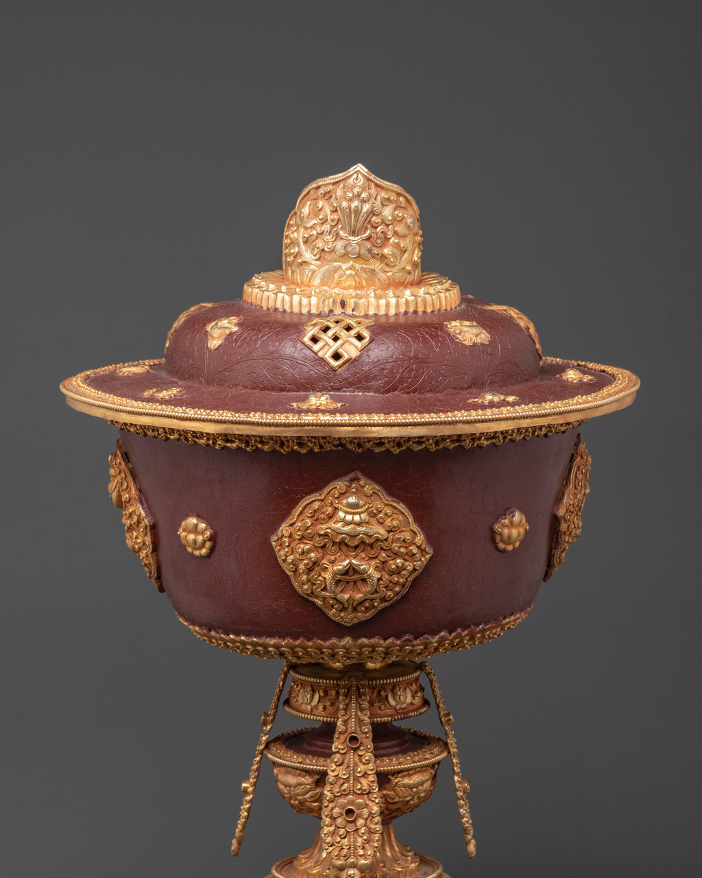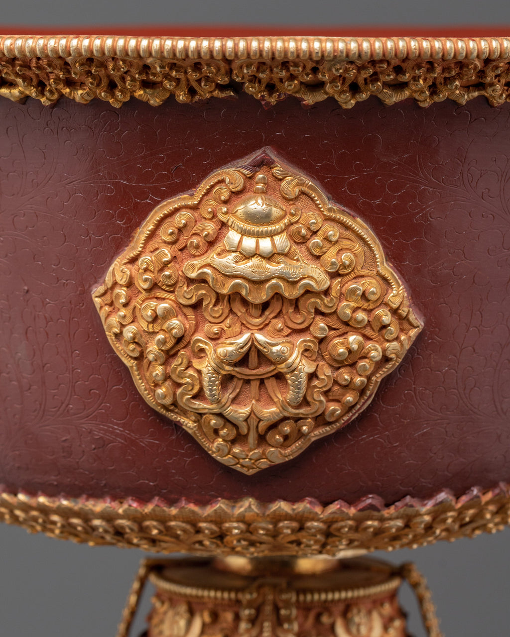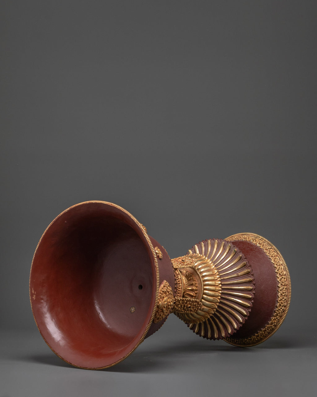 The lamp is meticulously crafted and features an oxidized copper base measuring 22.5 cm in diameter. The lamp's interior depth is 15cm, making it ideal for storing traditional butter or oil during ceremonies. Weighing 4.64 kg, this large lamp has a commanding presence that elevates any religious space, instilling devotion and reverence. Its design makes it both a valuable spiritual tool and a lovely complement to any Buddhist home decor. The gold-plated accents lend a touch of refinement, resulting in an extraordinary piece that will stand out on any altar or meditation room.
