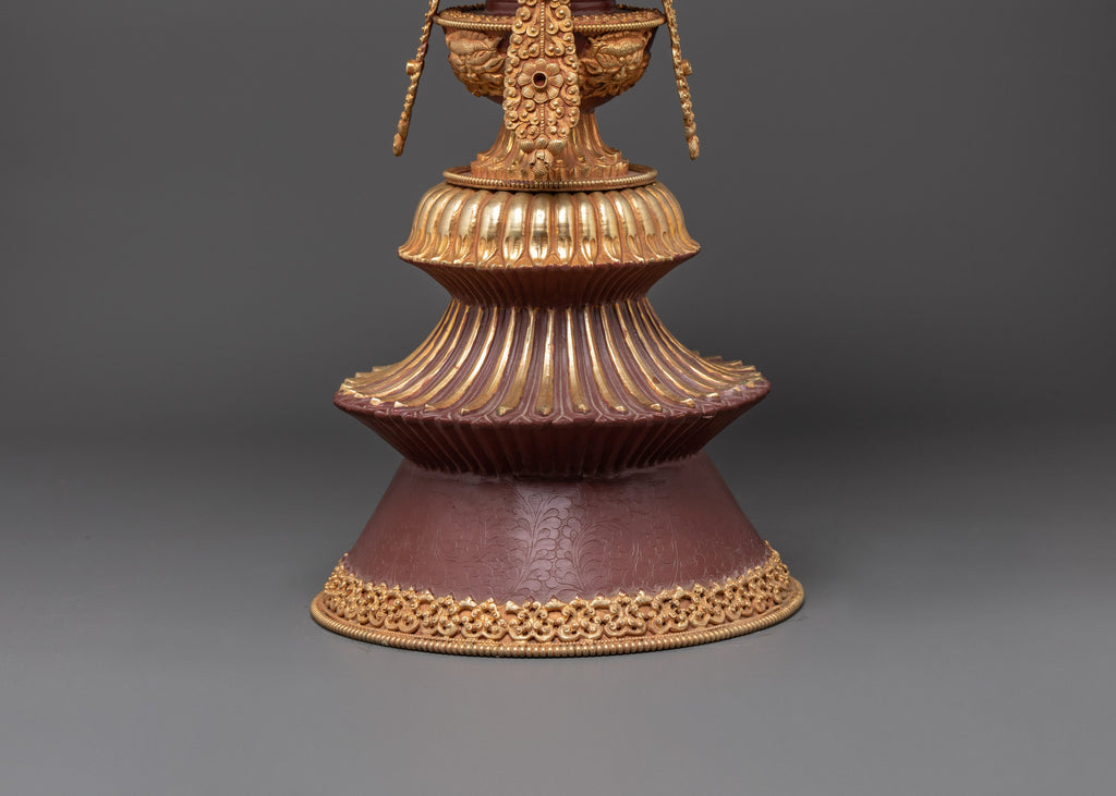 This handcrafted Tibetan butter lamp adds a sense of sacred light to your home or spiritual area. This lamp, which stands 60 cm tall and has a diameter of 31 cm, is a remarkable example of traditional Tibetan artistry combined with spiritual symbolism. The oxidized copper body is wonderfully reflected by gold-plated accents, which emit a rich and warm glow when lit. Traditionally, this butter lamp is utilized in Tibetan Buddhist rituals as an offering to deities, representing the illumination of the path to wisdom and enlightenment. When placed on a meditation table, altar, or shrine, it produces a quiet and tranquil environment that promotes tranquility and concentration during meditation or prayer.