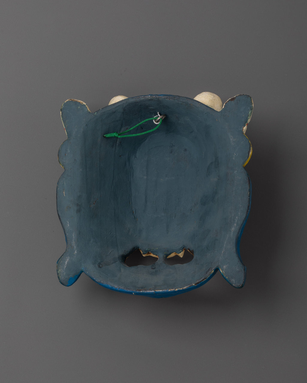 The intricate ceremonial design showcases traditional Tibetan artistic elements used in monastery Cham dance rituals. The brilliant blue coloring signifies the immutable nature of enlightened consciousness, while the red flame patterns around the mouth represent the purifying fire of wisdom. Golden yellow ear ornaments and decorative skull motifs add authentic monastery craftsmanship details. This mask embodies the wrathful compassion found in Vajrayana Buddhism, where fierce deities use terrifying appearances to protect devotees and transform negative energies into spiritual power for Buddhist practitioners seeking divine protection.