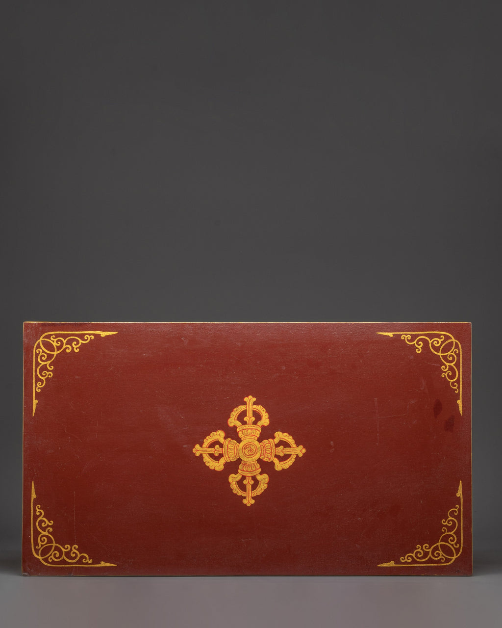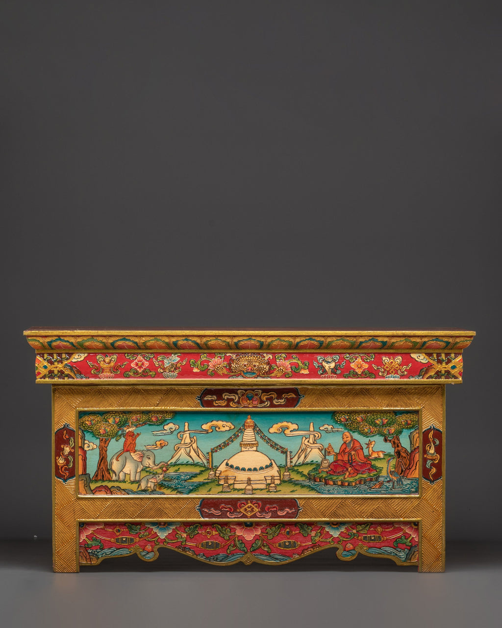 Crafted with precision, this Tibetan folding table, weighing 4.50 kg, is ideal for use in various places. The 37cm side width allows the table to carry a wide range of items, including candles, statues, and spiritual objects. The use of acrylic colors lends the table its magnificent brilliance, creating a fantastic appearance that adds spiritual depth to any home or meditation room. This table, whether put in a Buddhist shrine, living room, or meditation space, exudes tranquil energy.