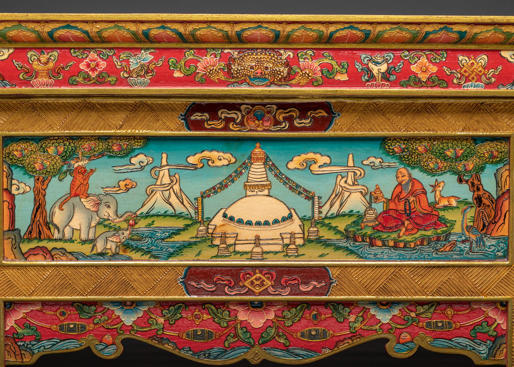 This table's craftsmanship honors Tibetan artistry by combining wood with elegantly hand-painted Buddhist themes. The wonderful paintings embody Buddhist concepts of peace and harmony, elevating this piece from mere furniture to a spiritual object that invites contemplation and relaxation. This Handcrafted Tibetan Folding Table, ideal for individuals seeking to enhance their spiritual practices or add a culturally rich décor element, is sure to enhance the atmosphere of any space.