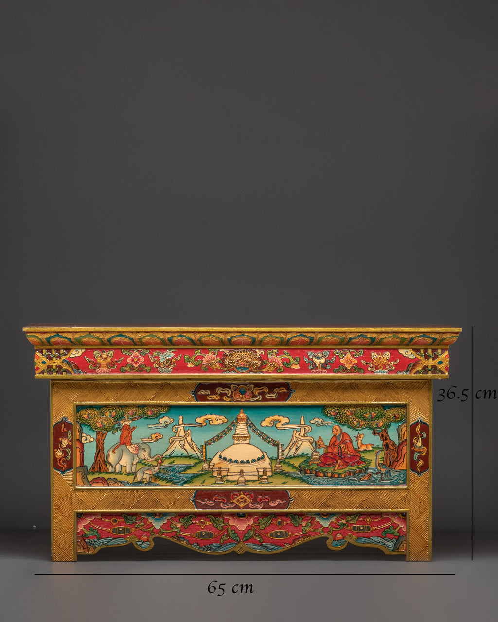 Enhance your living environment with our Handcrafted Tibetan Folding Table, expertly designed with hidden Buddhist artistry. This lively table serves as both an everyday piece of furniture and a distinctive work of art that enhances the spiritual and cultural depth of any environment. The table, constructed from wood, showcases vibrant colors and intricate artwork that represent Buddhist meaning, with serene themes and spiritual motifs. This table, measuring 36.5 cm in height and 65 cm at the base, is ideal for meditation, prayer, or as a striking decorative feature.