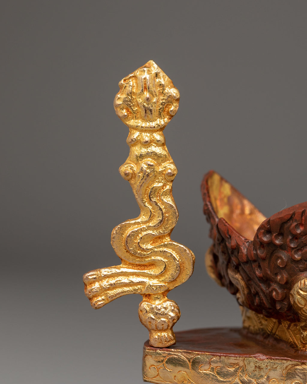 This Tibetan Sacred Kapala is expertly crafted with a copper body, gold-plated for a rich, aesthetic look. The use of acrylic paint highlights the detailing and gives the sculpture an energetic finish, making the delicate carvings and design features stand out. The Sacred Kapala, at 18.5 cm high and 12 cm wide, is both tiny and striking, making it a versatile addition to any spiritual or decorative setting. Its weight of 0.68 kg gives it an essential appearance while staying easy to handle and show.