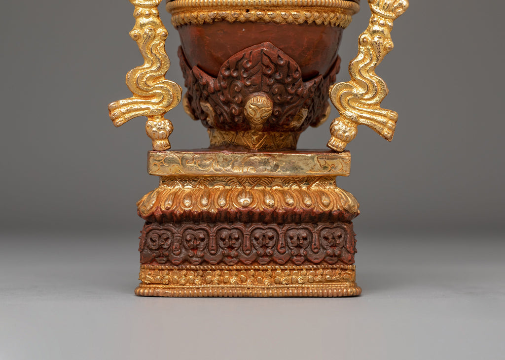 This Sacred Kapala is a masterfully crafted ritual object that embodies the rich symbolism of Tibetan Buddhism. It has a detailed copper body with gold plating, demonstrating exceptional craftsmanship. The Acrylic color emphasizes the detailed design, adding colorful touches to the overall look. This kapala symbolizes the transformation of negative emotions, such as greed and anger, into primal wisdom. The jar is embellished with golden handles shaped like flames, which represent the transformation and cleansing processes. The entire design, with its exquisite carvings and fine finish, makes this piece an effective instrument for meditation and ritual practices, allowing practitioners to connect with higher spiritual realms while reflecting on the impermanence of existence and the opportunity for inner transformation.