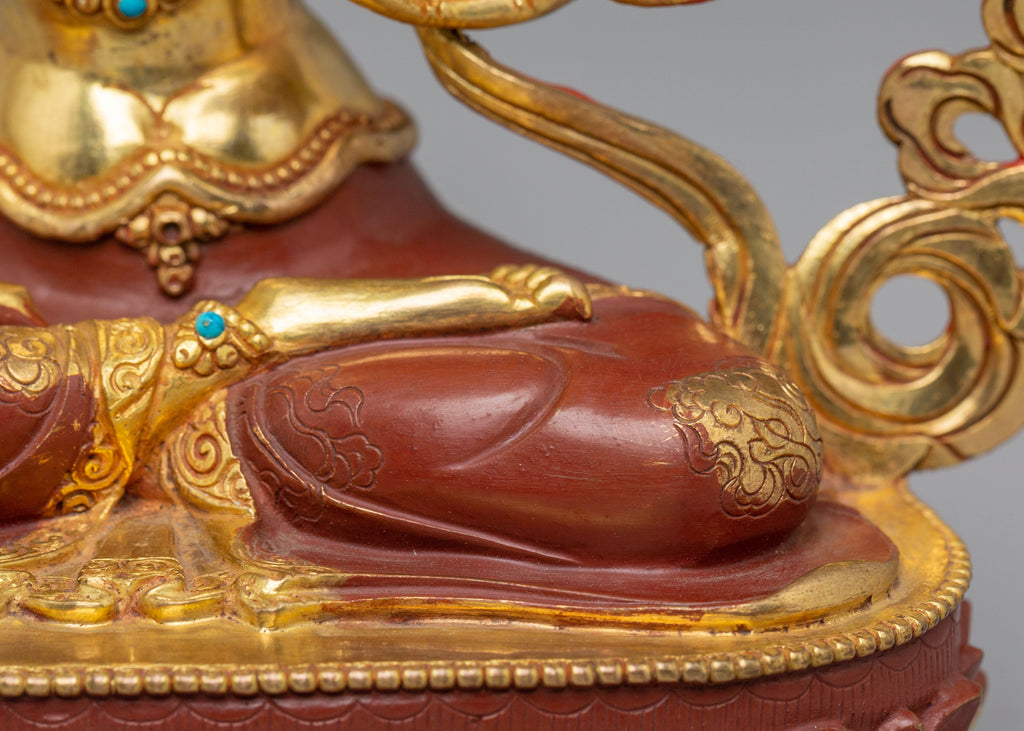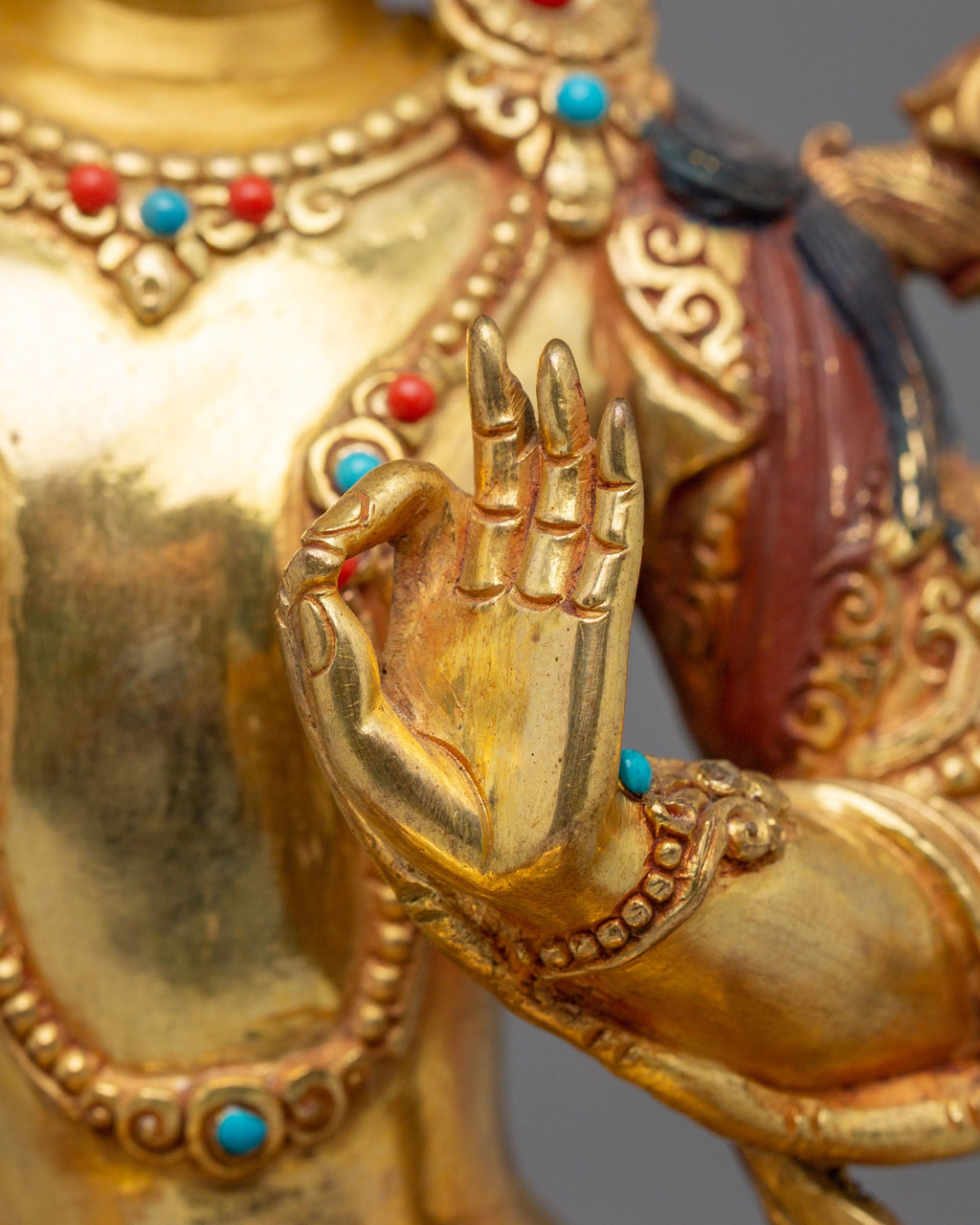 With our Manjushree Bodhisattva Figurine, you may bring the embodiment of wisdom and understanding into your home. This statue stands 22 cm tall and has a 19.5 cm base, making it an ideal addition to any home, shrine, or meditation place. The statue is made of copper, 24k gold gilded, and ornamented with acrylic color, symbolizing the rich legacy of Nepalese craftsmanship.