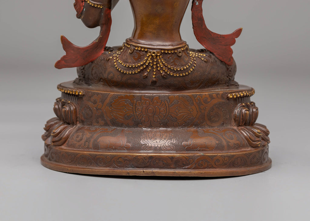 TheHandcrafted Tibetan Manjushri Bodhisattva Sculpture is a striking piece of art that represents the Bodhisattva of wisdom, Manjushri, who symbolizes enlightenment and the pursuit of knowledge. Standing at 23 cm in height and 17 cm in width, with a weight of 1.75 kg, this sculpture is crafted with meticulous attention to detail. The oxidized copper body is enhanced with 24K gold gliding and electro gold plating, giving the statue a radiant and divine appearance. The acrylic colors bring out the intricate details of the sculpture, creating a balanced and harmonious representation of Manjushri's wisdom and compassion.