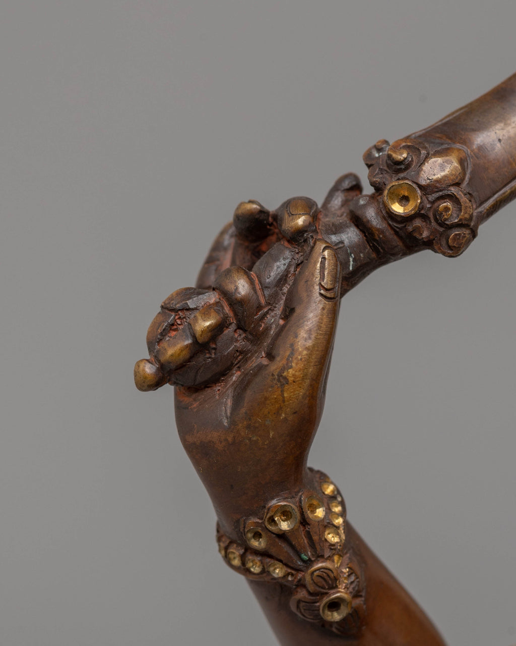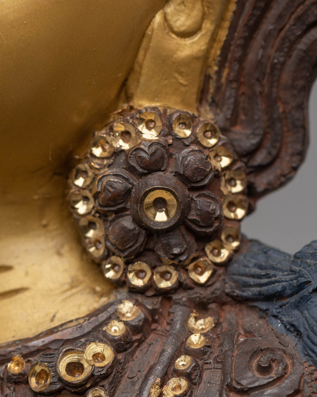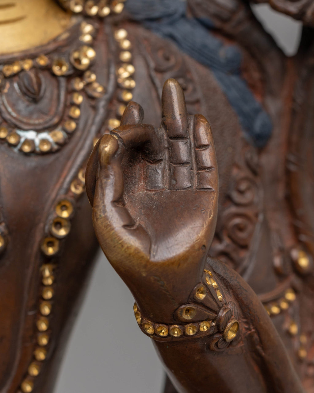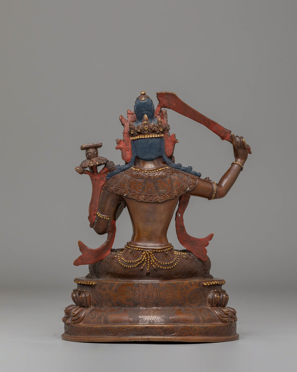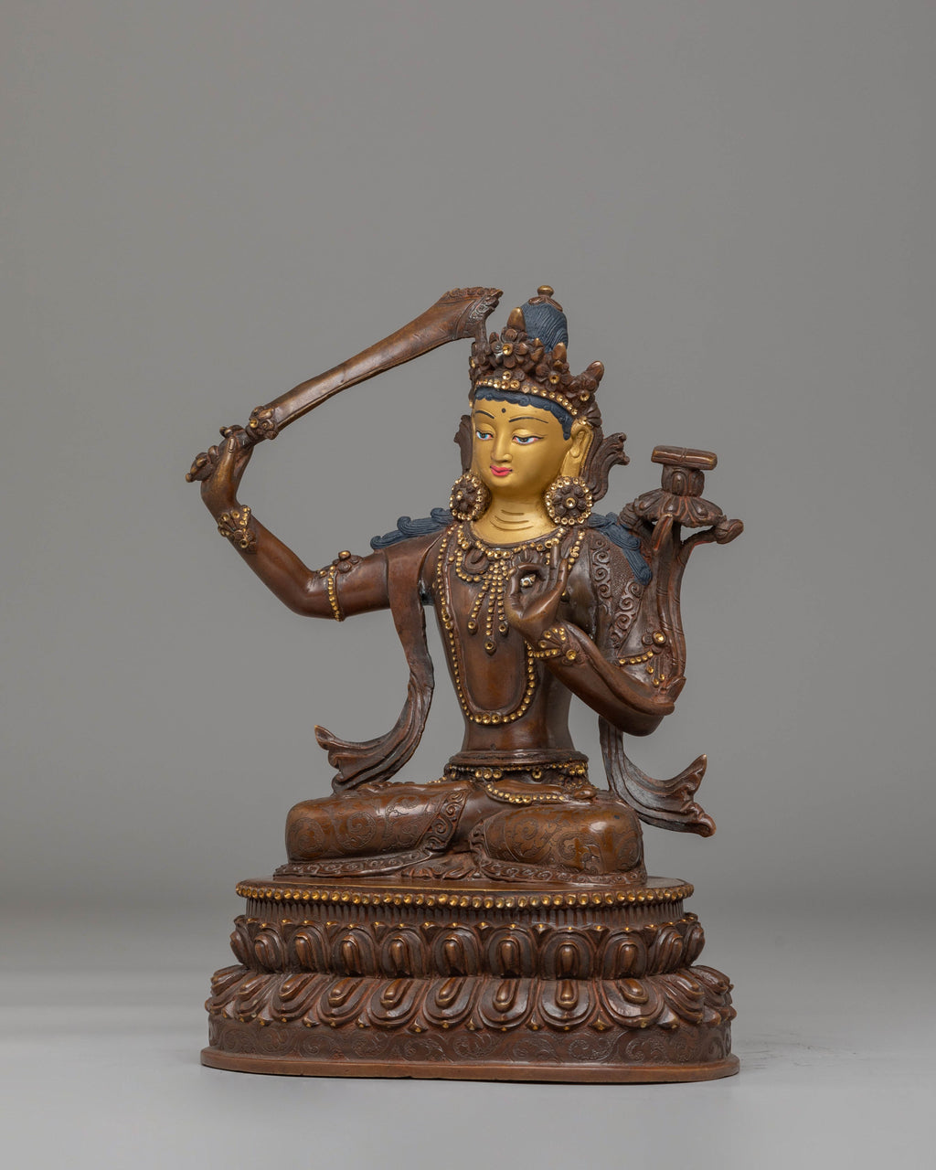 This Bodhisattva sculpture features Manjushri in a seated position, with a serene and contemplative expression, holding a sword in one hand and a scripture in the other. These elements represent the cutting of ignorance and the embodiment of wisdom. The gold gliding further enhances the divine nature of this piece, while the oxidized copper body provides a rich, earthy base that contrasts beautifully with the radiant gold and vibrant colors used for the finer details, such as the robes and accessories.