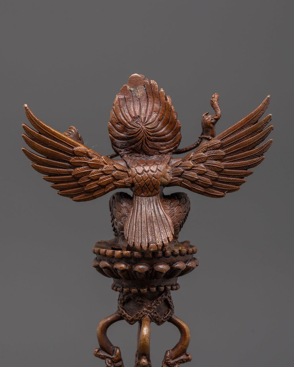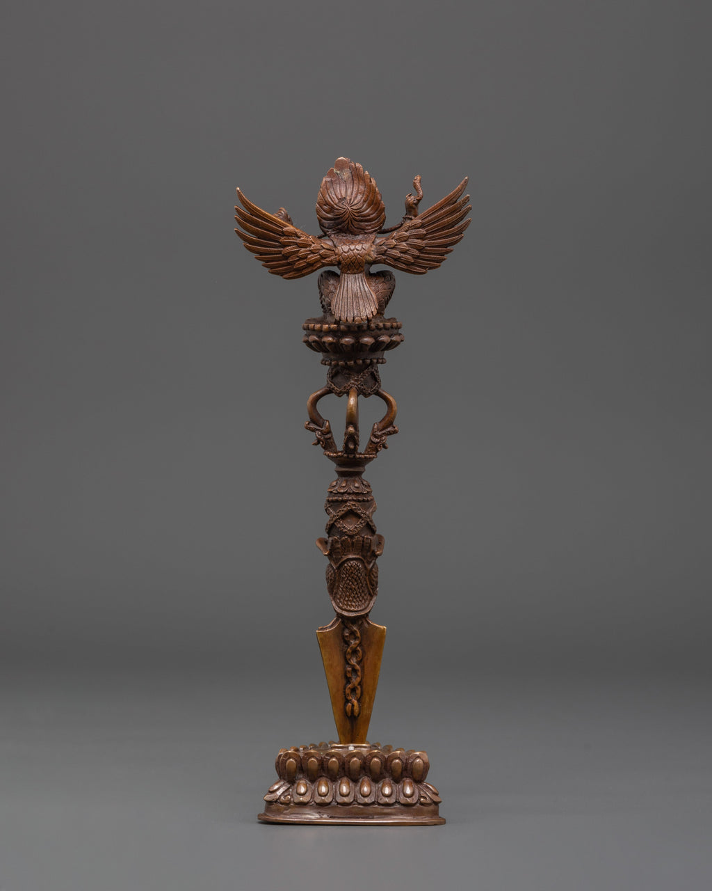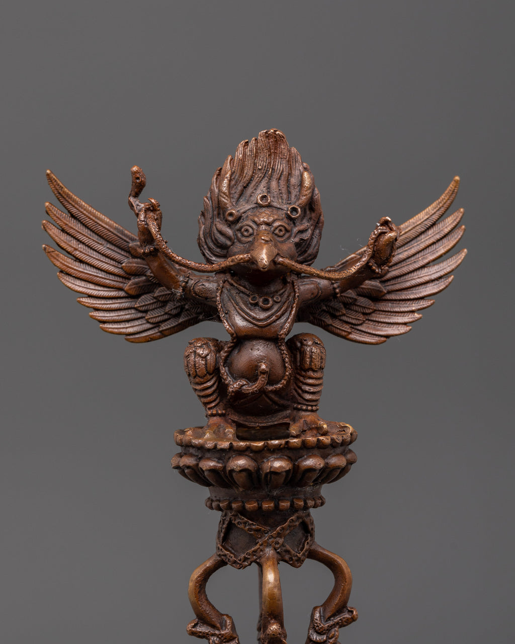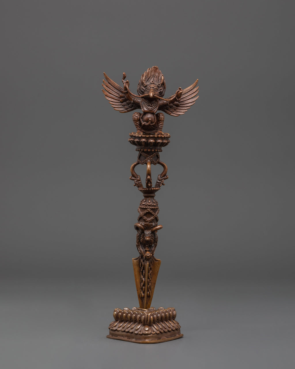 At the summit of the phurba is the powerful Garuda deity, a legendary bird representing strength, protection, and the annihilation of evil. The Garuda's spread wings and robust stance represent its capacity to soar above obstacles and defeat bad forces. The center of the blade bears traditional Tibetan decorations, including knot motifs that represent the endless cycle of life and the power of transformation, symbolizing the phurba's role in the ritual practice of capturing bad energies and protecting the practitioner.