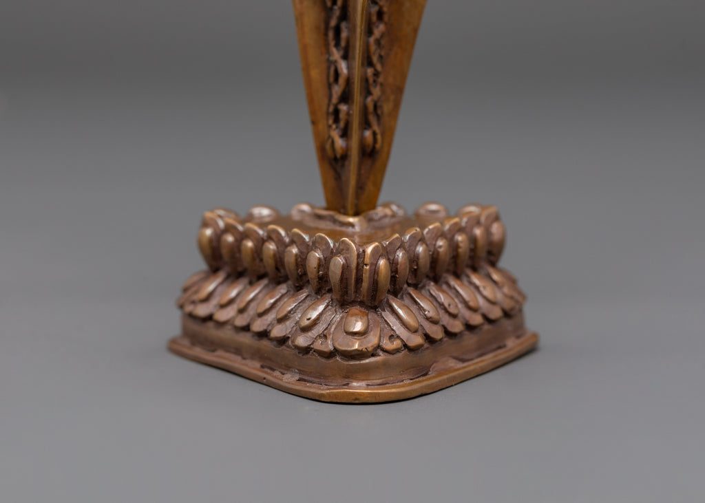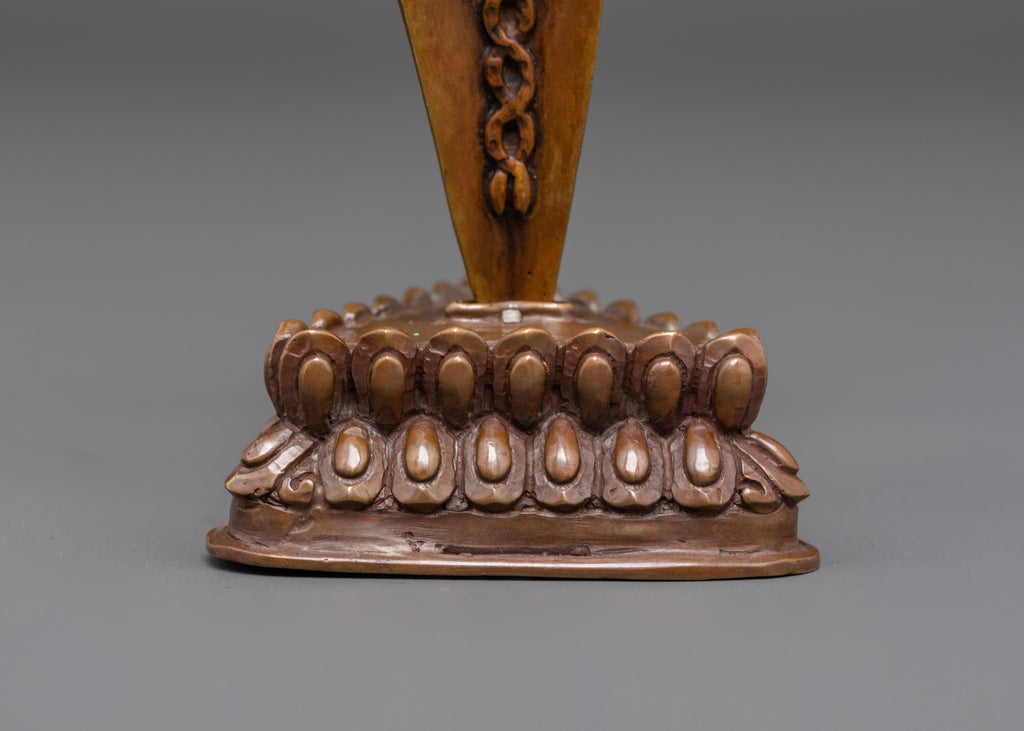 Aside from its artistic splendor, this Tibetan ritual phurba is a sacred spiritual instrument used for meditation and ceremonial rites. It channels protective and purifying forces, making it a must-have for individuals interested in Tibetan Buddhism or spiritual instruments. The combination of handcrafted rusted copper and elaborate designs adds authenticity and depth to this phurba, making it both a strong ceremonial dagger and an intriguing treasure.