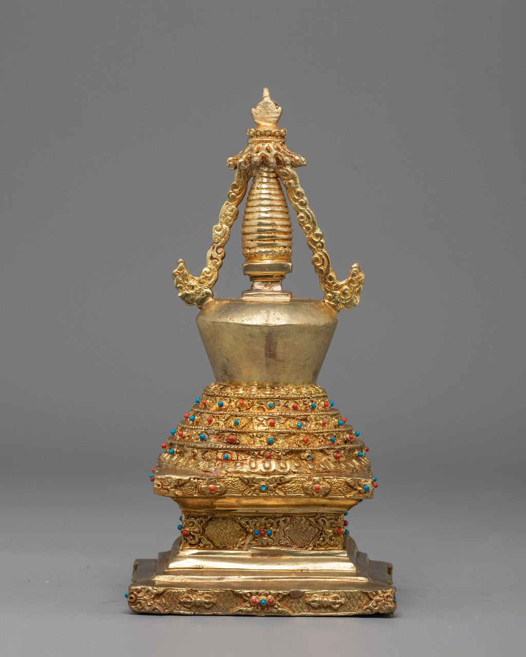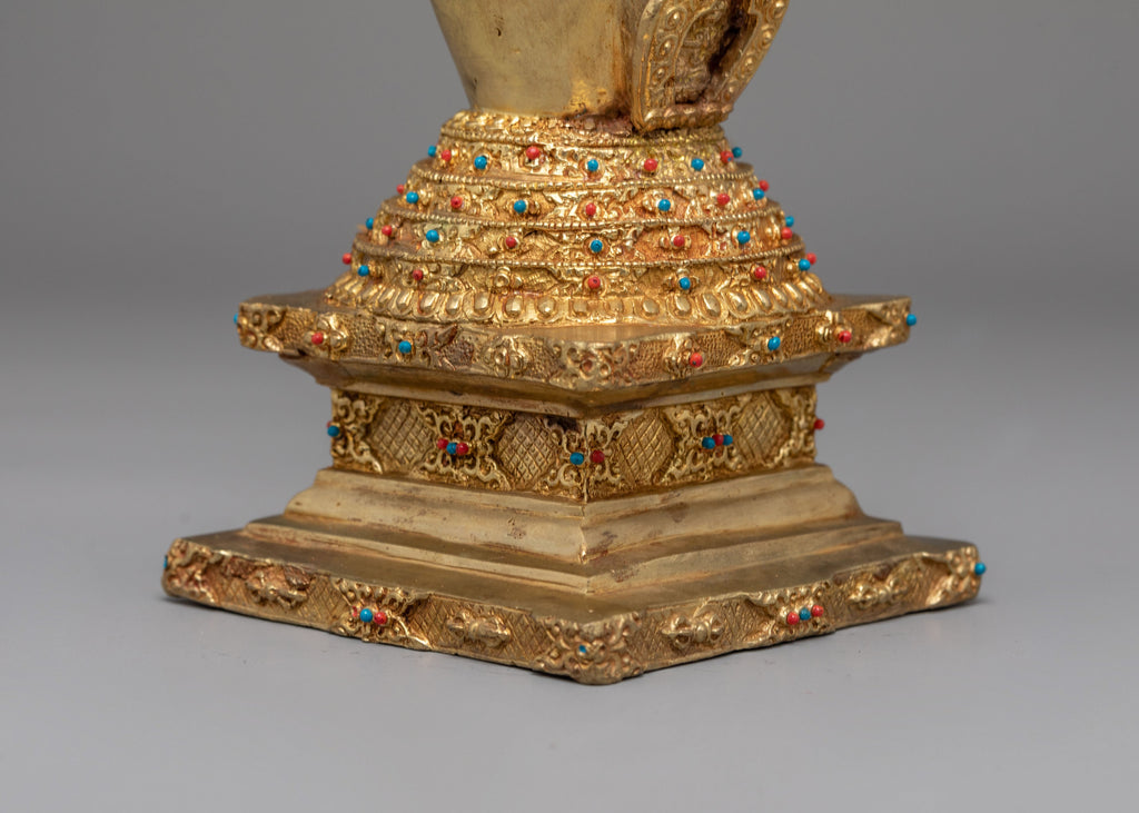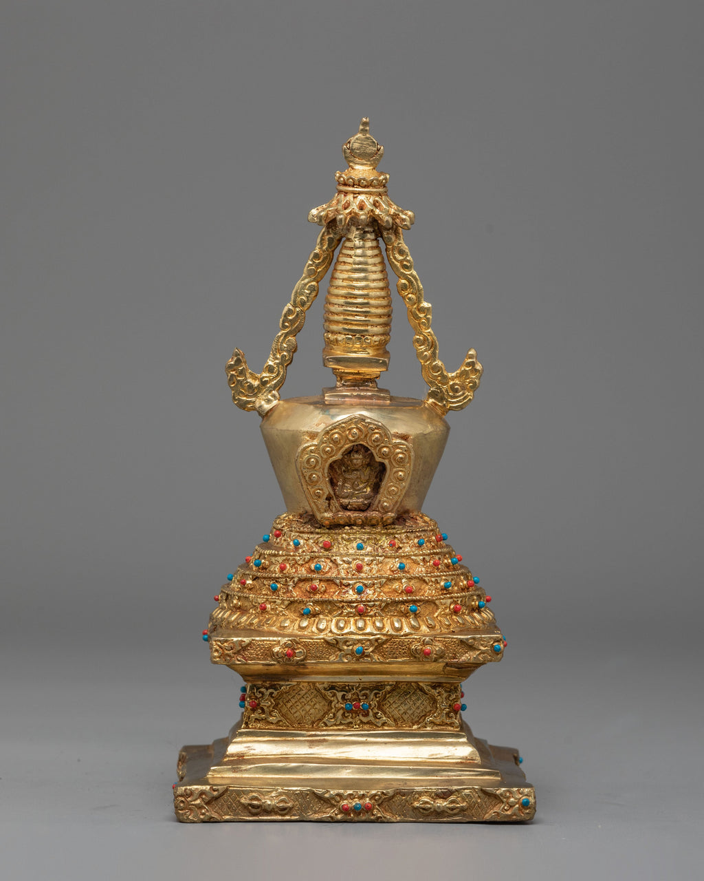 Every element of this Tibetan Buddhist stupa is meticulously designed with intricate carvings and inlaid with artificial coral and turquoise stones, symbolizing purity and protection. The golden tiers are adorned with sacred motifs that reflect the stages of enlightenment and the teachings of the Dharma. The central niche houses a miniature Buddha figure, representing divine presence and spiritual awakening. Each hand-applied detail reflects centuries of Himalayan craftsmanship, carrying both artistic beauty and deep spiritual meaning.