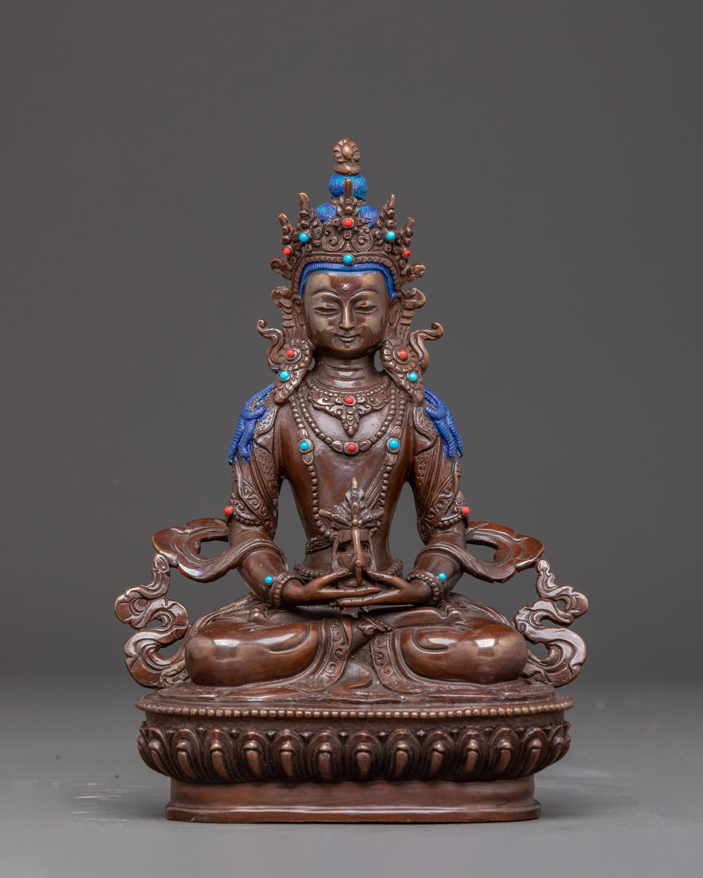 The Handcrafted Tibetan Sacred Amitayus Statue stands 8.5” (21.5cm) tall with a 5.7” (14.5cm) broad base and weighs 1.22 kg. Made from oxidized copper, it features acrylic paintings and gemstones that enhance its serene presence. Expertly handcrafted by skilled artisans in Nepal, this statue embodies traditional Himalayan craftsmanship and serves as a meaningful addition to altars, meditation spaces, or spiritual collections focused on longevity and inner peace.