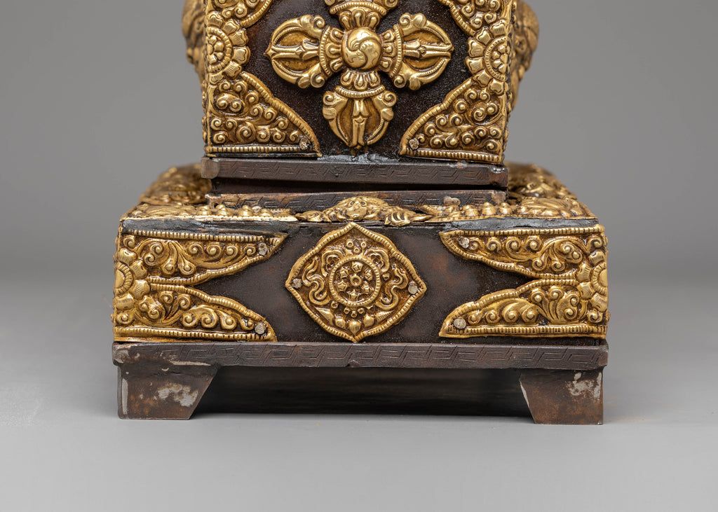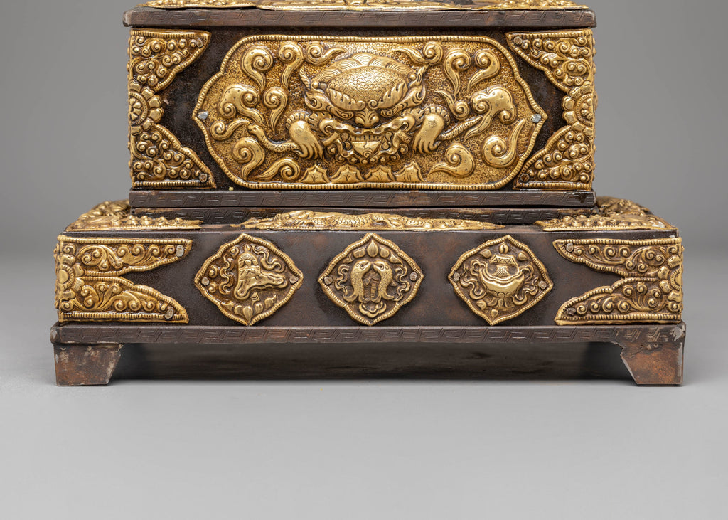 The decorative panels display protective creatures and sacred emblems often seen in Tibetan temples and ritual objects. These symbols are believed to represent blessings, spiritual harmony, and cultural heritage. The intricate brass work reflects Tibetan craftsmanship, where each motif carries meaning, from strength and guidance to prosperity and inner balance. The piece brings an air of cultural richness and artistic expression to any setting.