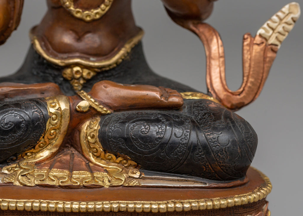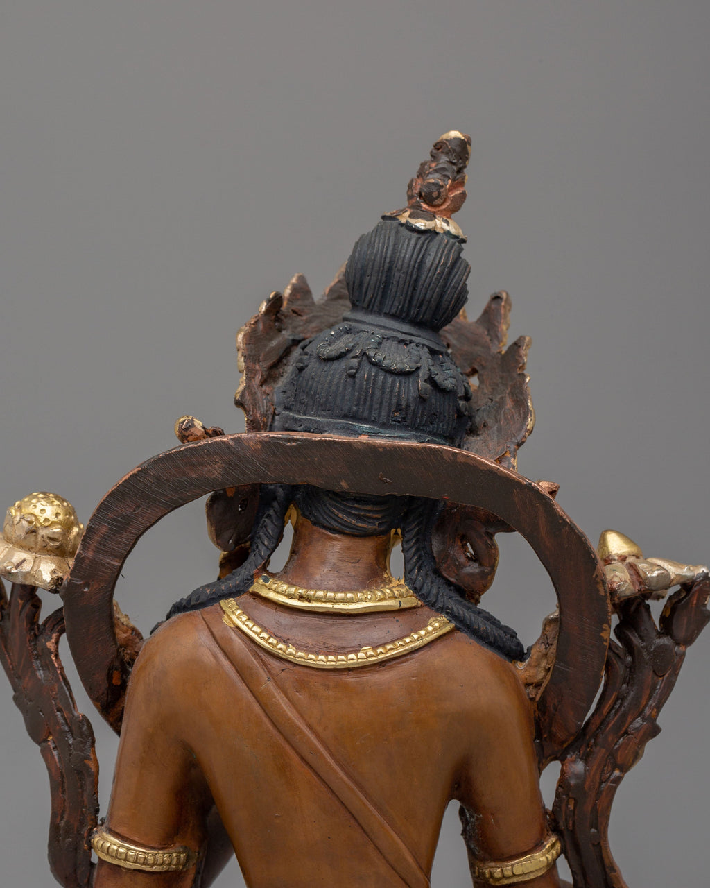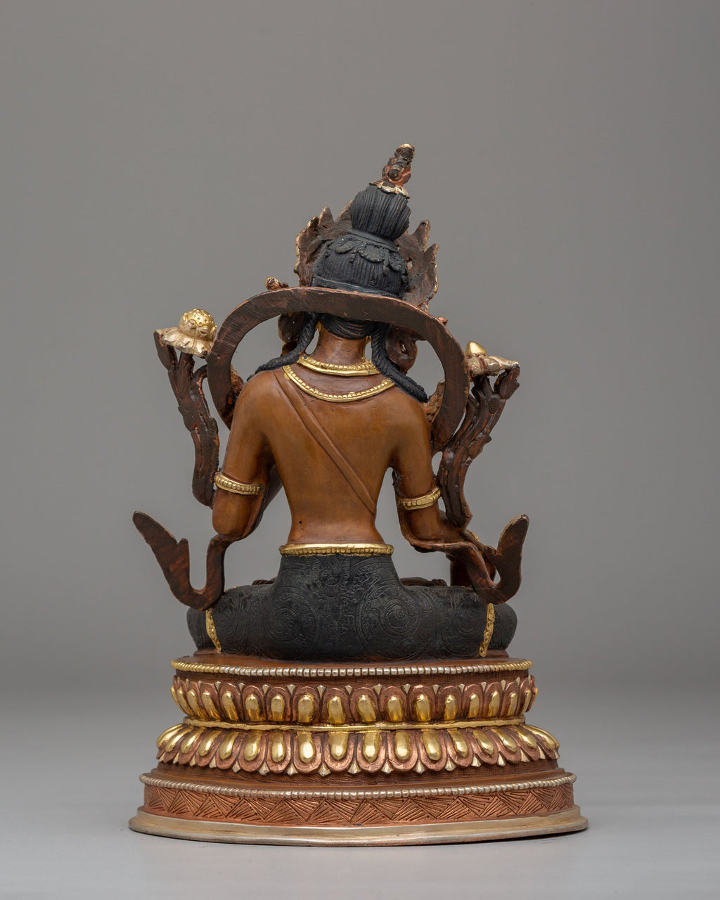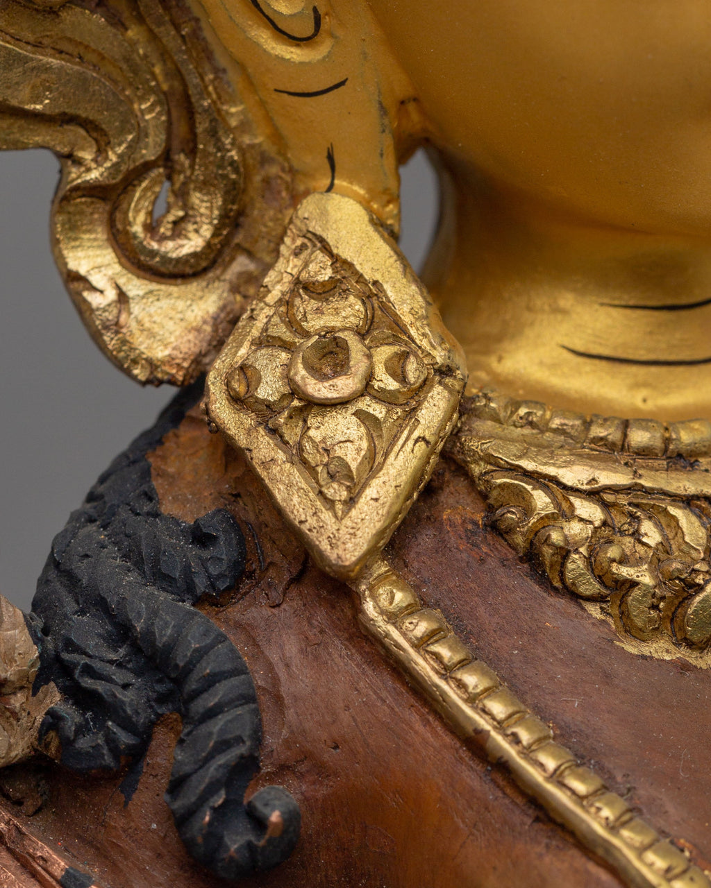 The design of this Handcrafted Tibetan White Tara Copper Statue holds deep spiritual significance, as White Tara is often seen as a deity who bestows blessings of peace, health, and protection. Her serene and graceful expression embodies the calm presence of a loving protector, making her an ideal figure for meditation and spiritual reflection. The intricate details of the statue, from the flowing robes to the elegant hand gestures, are a testament to the exceptional craftsmanship of Tibetan artisans. The gold and silver plating, combined with the copper base, imbue this statue with a sacred and radiant energy, making it a beautiful addition to any altar or spiritual space.