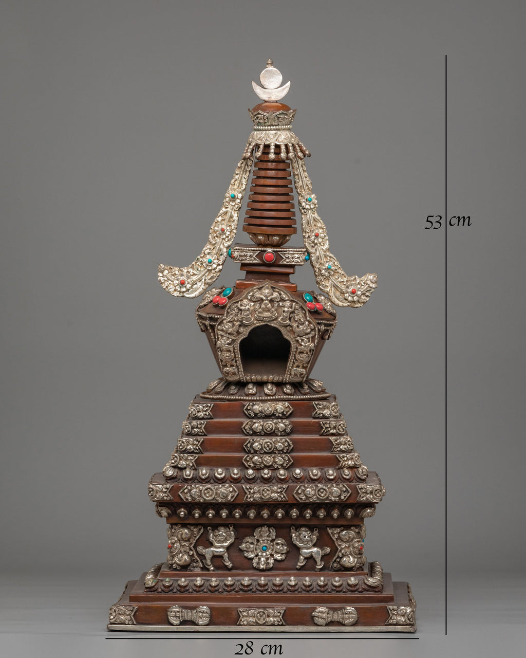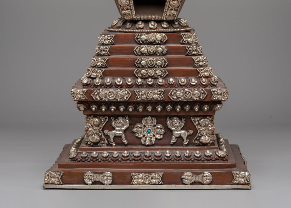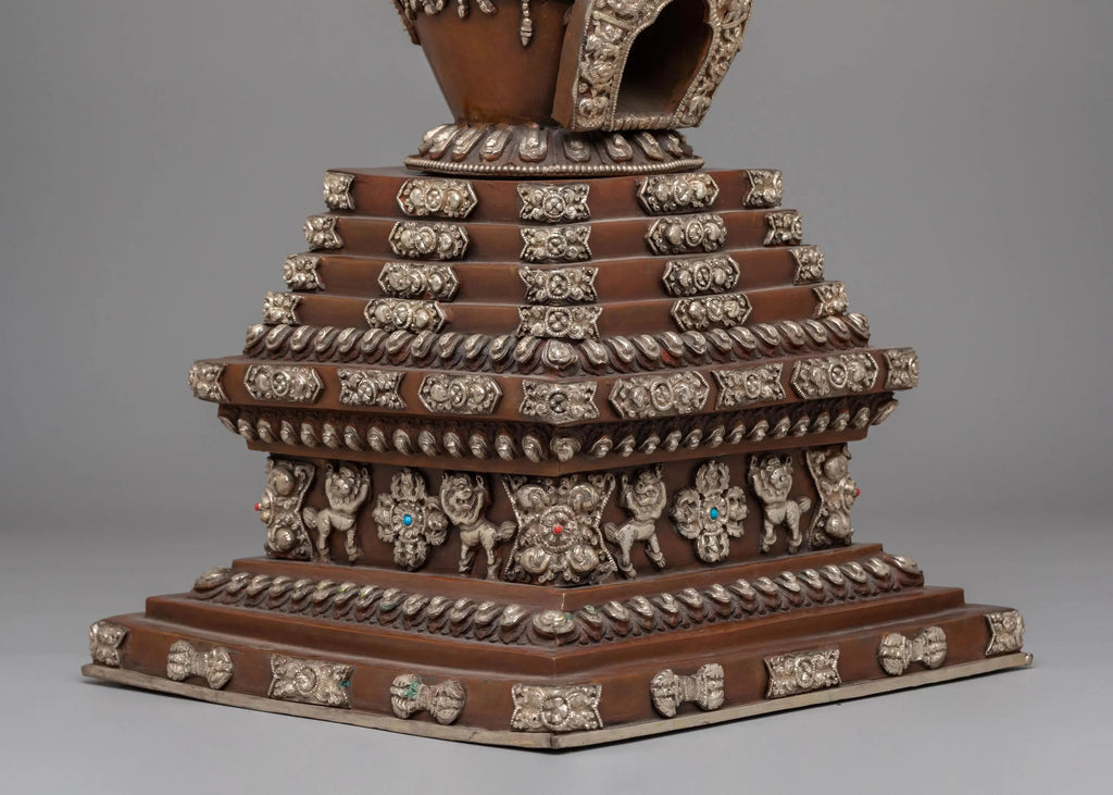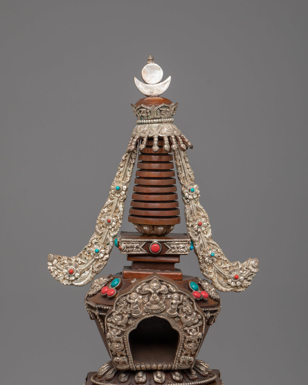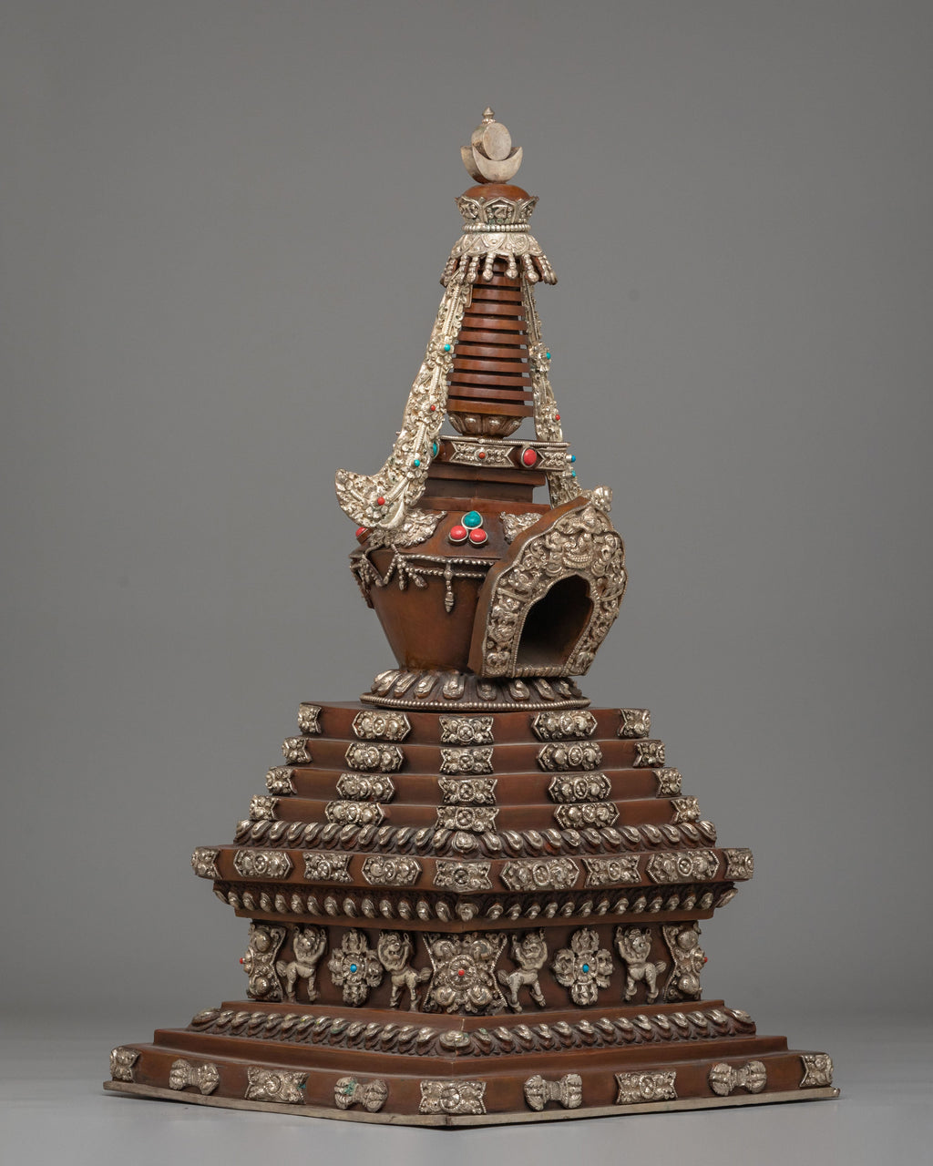 The stupa’s oxidized copper body offers a sense of ancient wisdom and grounding, while the electro silver plating adds elegance and light to the design. The gemstones inlaid throughout the stupa, including turquoise, coral, and lapis lazuli, hold deep symbolic meanings in Tibetan Buddhism. Turquoise represents spiritual wisdom, coral symbolizes vitality and protection, and lapis lazuli signifies truth and spiritual enlightenment. Together, these elements infuse the stupa with powerful energetic qualities, supporting practitioners on their spiritual journey and enhancing their rituals.