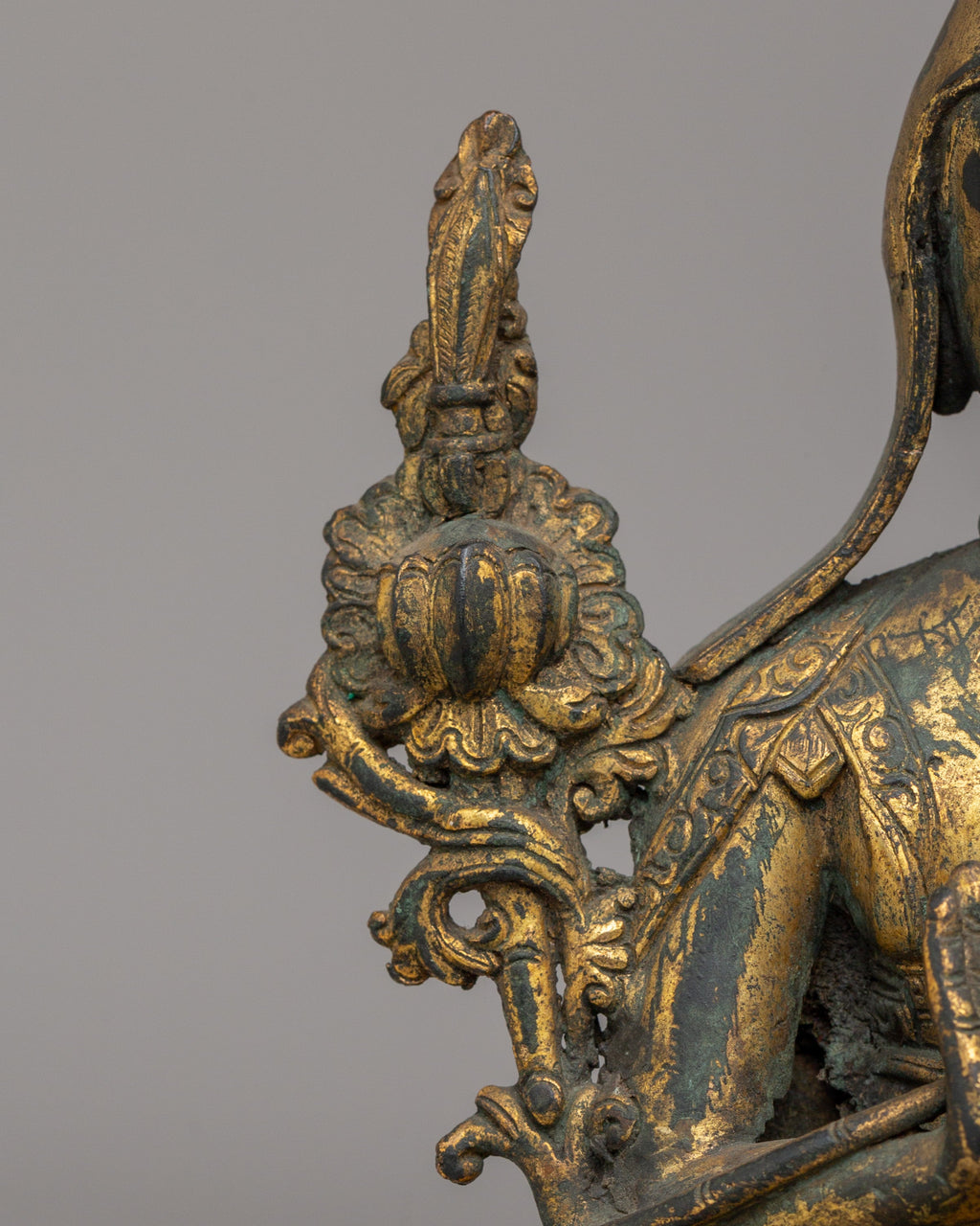 This Tibetan Tsongkhapa Buddhist Statue is a 60-year-old antique sculpture, crafted with a copper body, gold plating, and detailed using traditional acrylic colors. It measures 22 cm in height, 12 cm in width, and 10 cm in depth, suitable for personal altars and sacred spaces. The combination of aged copper and decades of devotional presence gives the statue a deep spiritual character. Its solid weight and hand-finishing highlight the traditional Tibetan craftsmanship, making it a meaningful piece for meditation altars, shrines, and sacred interiors.