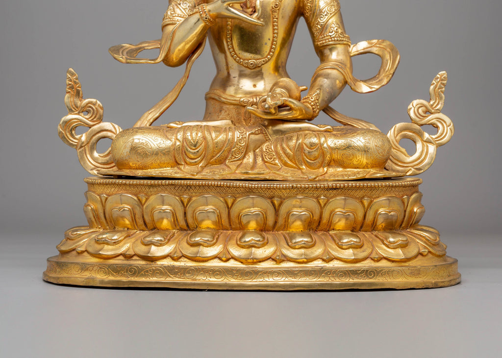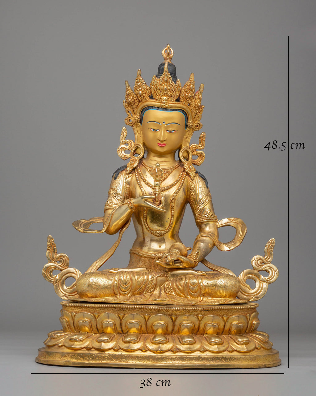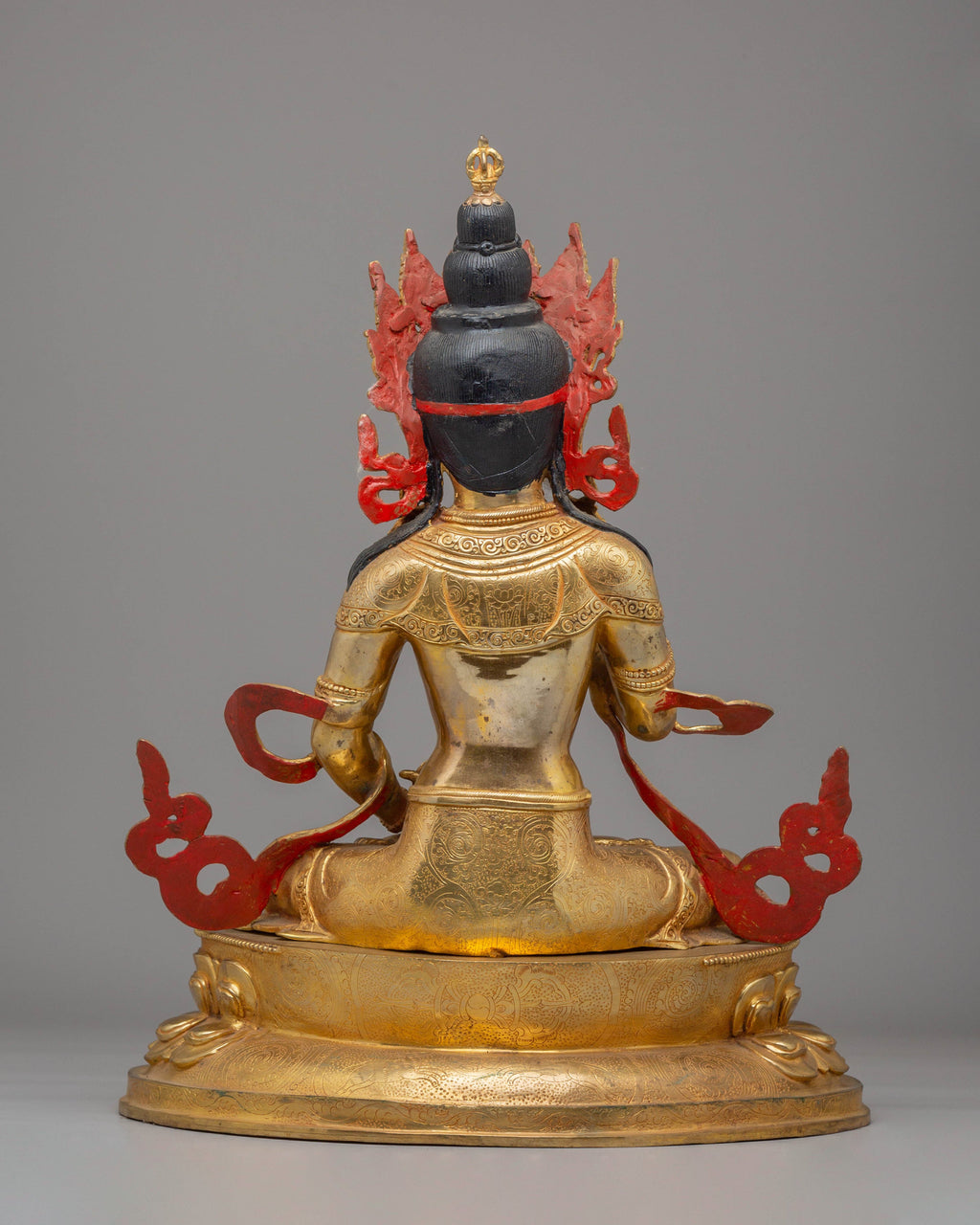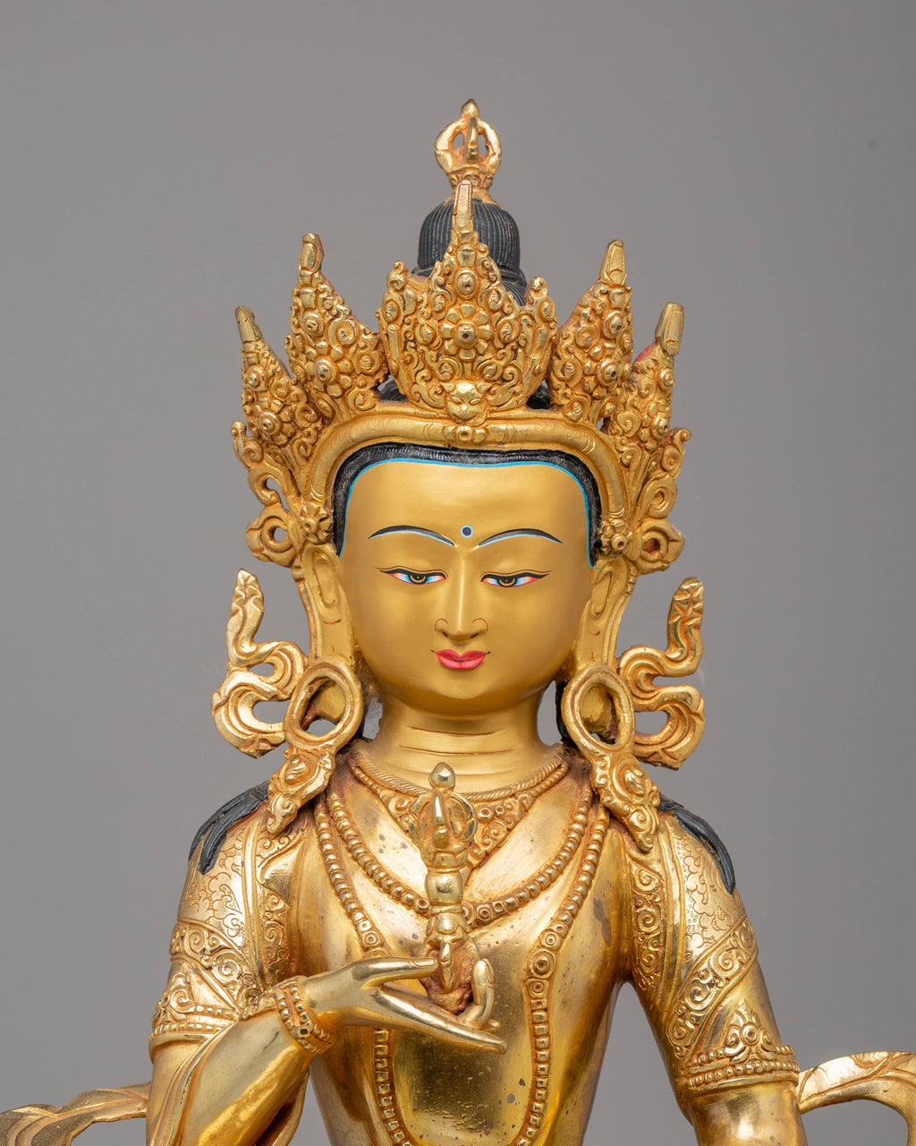 The statue's copper body provides a foundation, while the 24k gold plating adds a luxurious touch of divine radiance. The acrylic color enhances the statue's intricate features, bringing Vajrasattva's serene expression to life. This statue is not only a work of art but also serves as a powerful reminder of the importance of purification in the Buddhist path. Whether used for meditation, prayer, or as a decorative piece, it brings a sense of calm and spiritual energy to your surroundings.
