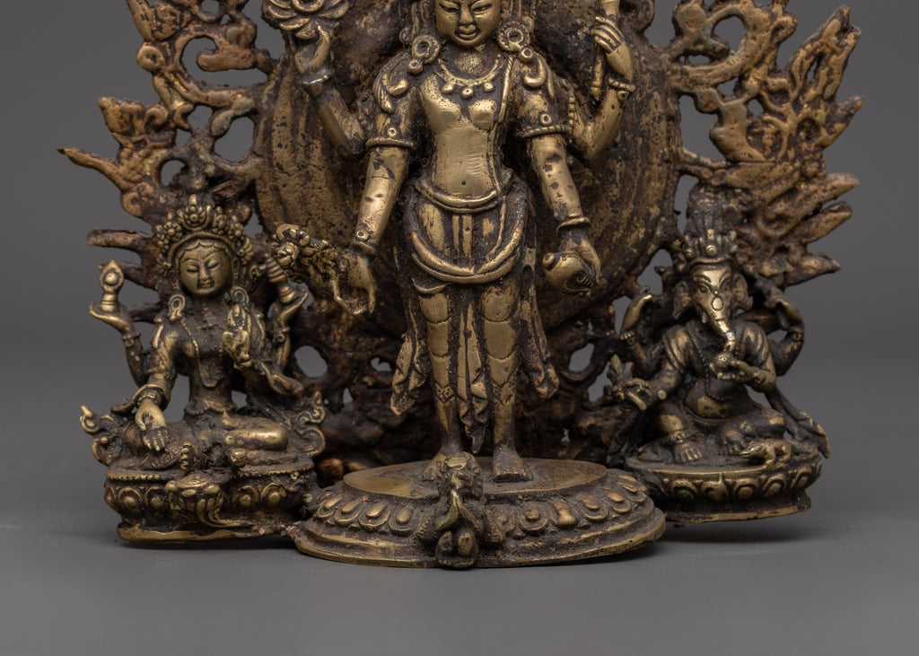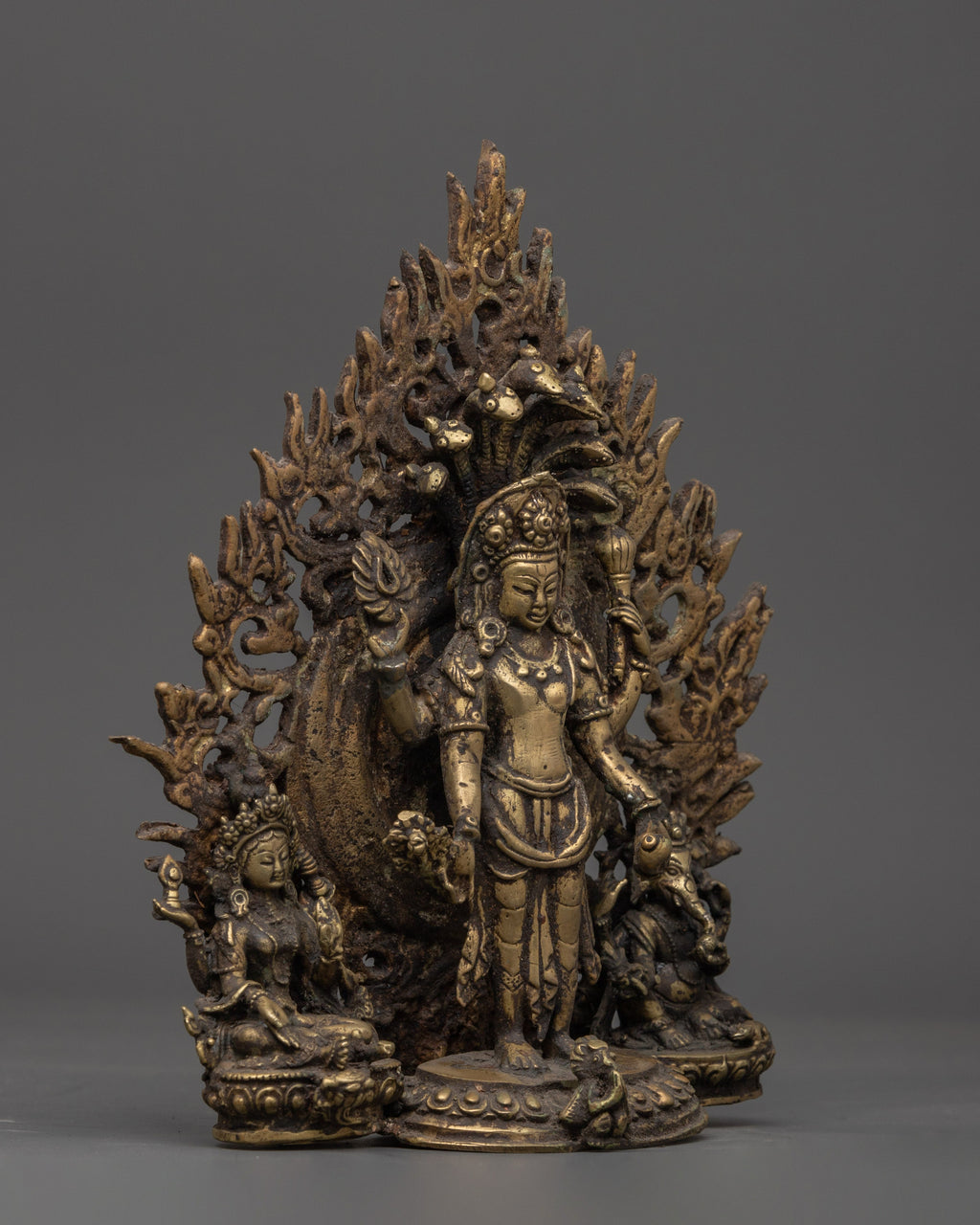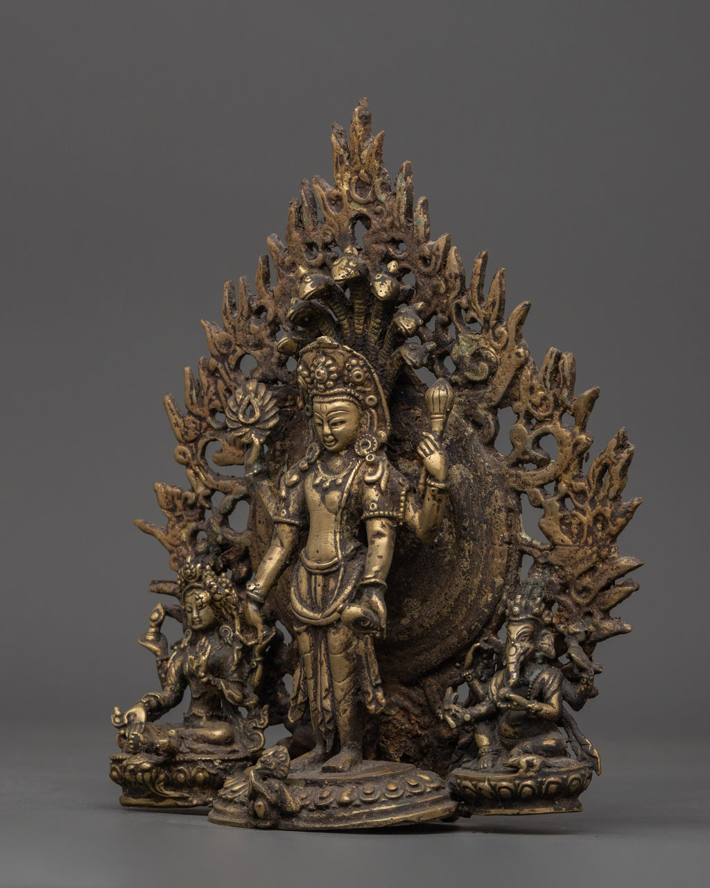 This statue is based on traditional portrayals seen in Hindu temples and art, with Vishnu's four limbs displayed in dynamic stances to highlight his active involvement in preserving cosmic equilibrium. The peaceful expression indicates the deity's wisdom, while the foundation on which the statue rests represents spiritual purity and heavenly beauty. The multi-headed serpent behind Vishnu is a traditional feature that represents the protection and power that Vishnu holds over both the divine and earthly realms.