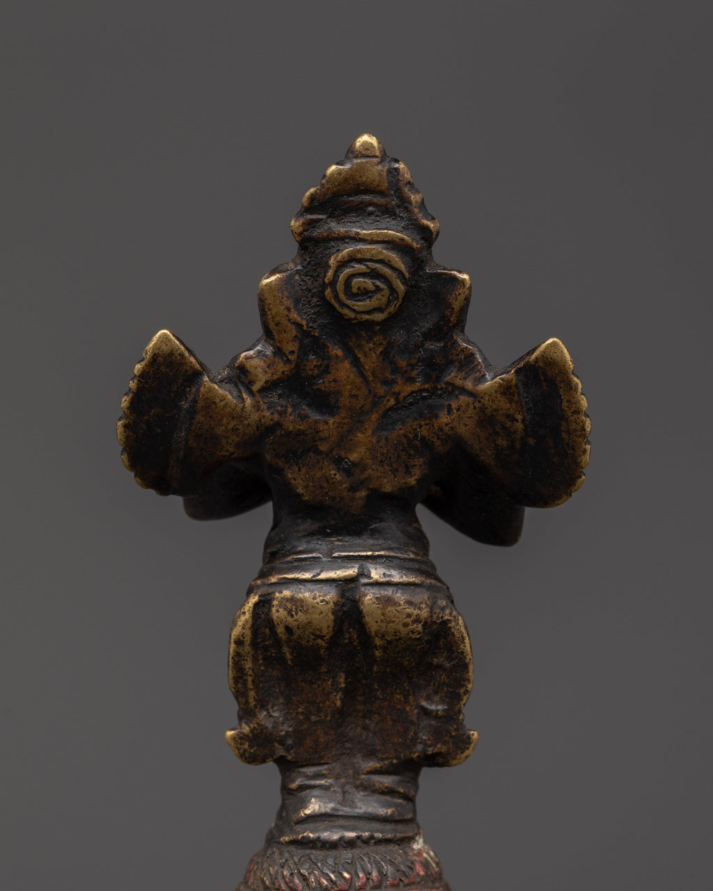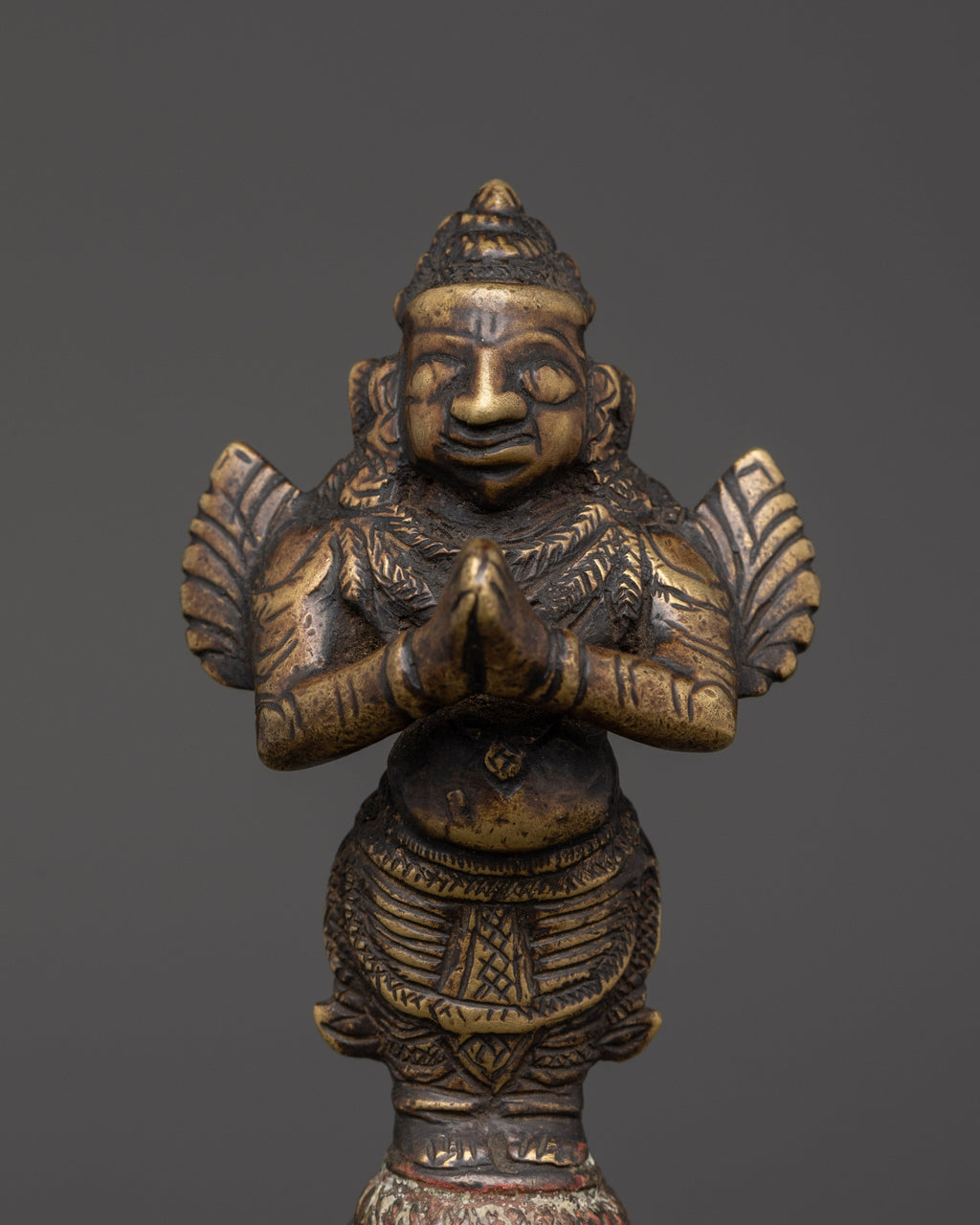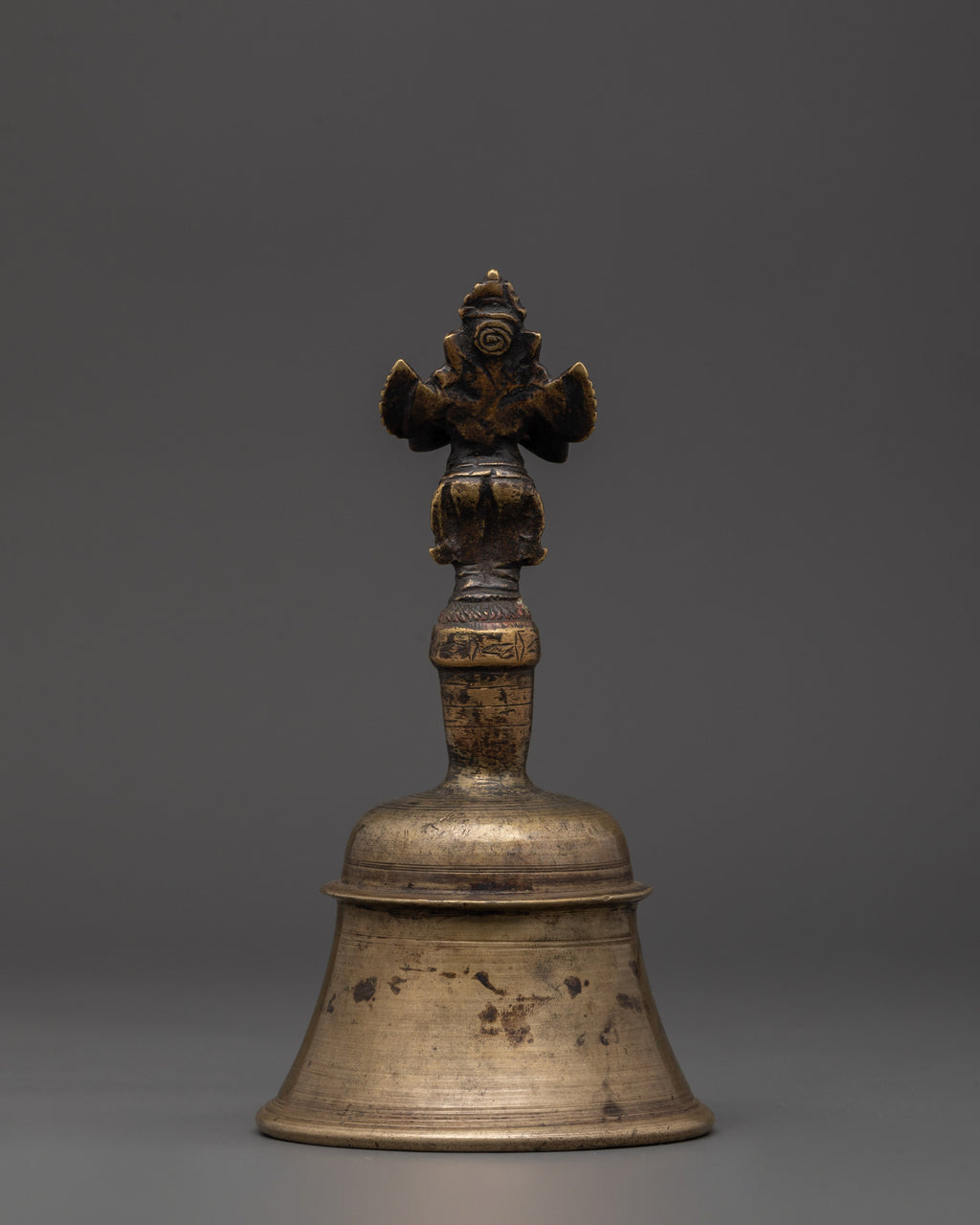 This handmade bell, measuring 19.5 cm in height and 10 cm in width, is skillfully crafted from bronze and symbolizes artisanal heritage. It provides the ideal balance of beautiful lightness and significant presence at a stylish 0.057 kg. A complex acoustic character that will appeal to discriminating collectors and practitioners, the bell's proportions have been carefully adjusted to provide a resonant tone that develops with exceptional clarity and sustain. Each piece has slight differences that set authentically handcrafted items apart, making them both highly distinguished objets art and useful tools.