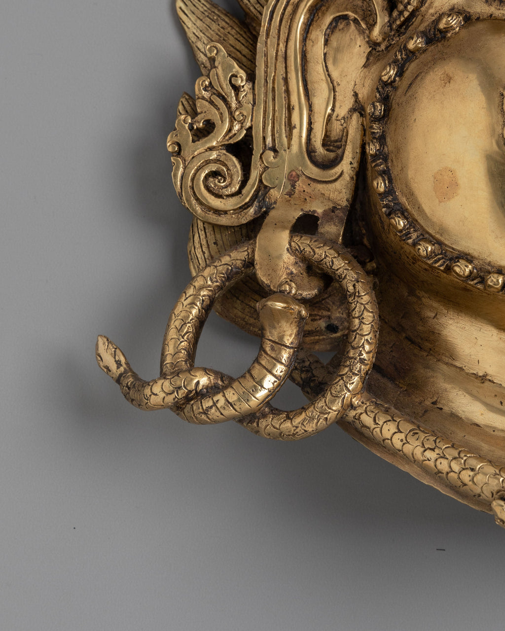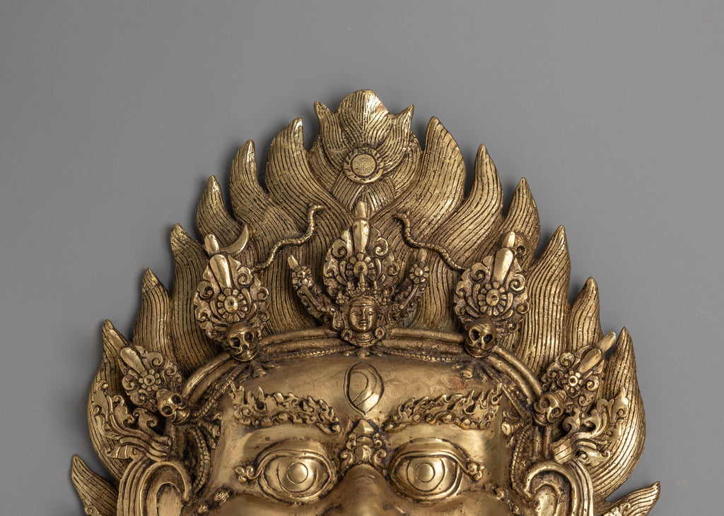 The intricate detailing in this wall hanging reveals exceptional artistry. The face of Bhairav is adorned with sharp, expressive eyes, an open mouth with fangs, and a crown of flames — each element radiating divine power. The surrounding motifs, including serpents and sacred ornaments, symbolize strength, wisdom, and awakening. The gold plating enhances the piece's sacred aura, catching light beautifully and adding depth to every carved detail. This Bhairav mask is not only an artistic treasure but also a spiritual emblem that embodies fierce compassion and cosmic guardianship.