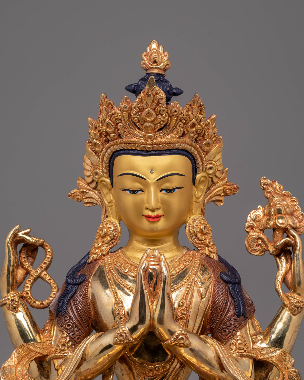 The gold-plated surface highlights each motif with clarity, while carefully applied acrylic colors enhance the crown, jewelry, and lotus throne. Every detail—from the elegant mudras to the intricately shaped ornaments—honors traditional Himalayan craftsmanship. The artistry conveys Avalokiteshvara’s compassionate energy, making this piece a meaningful addition to spaces focused on mindfulness, meditation, or spiritual inspiration.