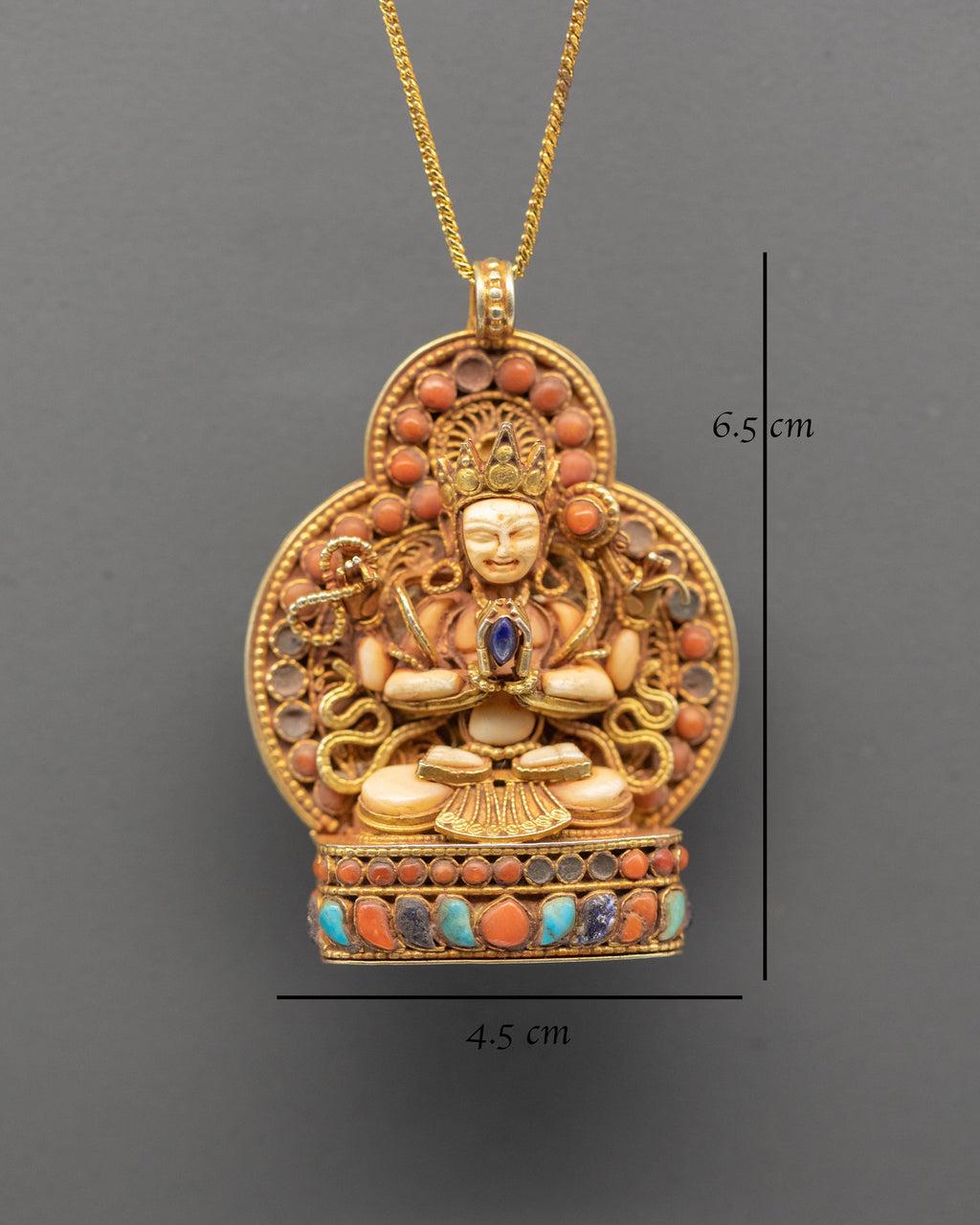 The Handmade Bodhisattva Chenrezig Locket is a stunning piece of spiritual jewelry, crafted with pure silver and gold-plated details. Measuring 6.5 cm in height and 4.5 cm in width, this locket features the revered Bodhisattva Chenrezig, known as the embodiment of compassion in Tibetan Buddhism. The intricate design showcases Chenrezig seated in a meditative posture, with his hands positioned in a gesture of compassion and blessings. Adorned with artificial stones like Lapis Lazuli, Turquoise, Coral, and Conch Shell, each stone holds symbolic significance, enhancing the locket's spiritual meaning.