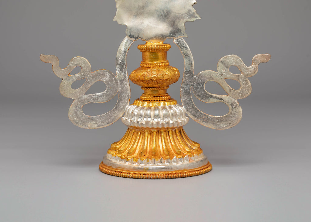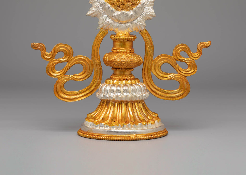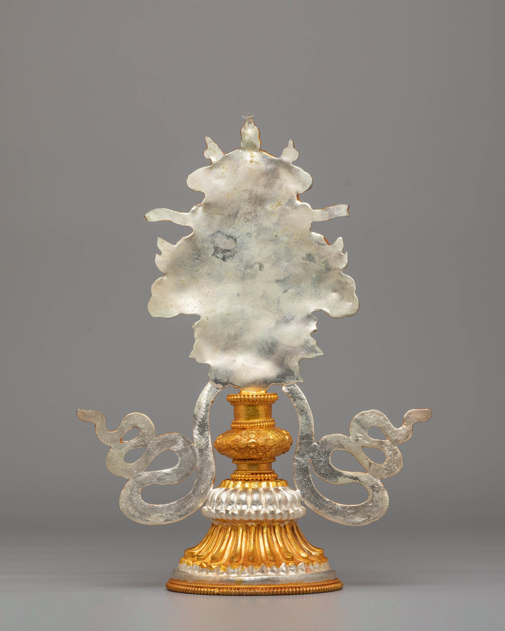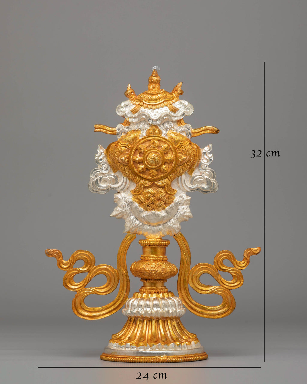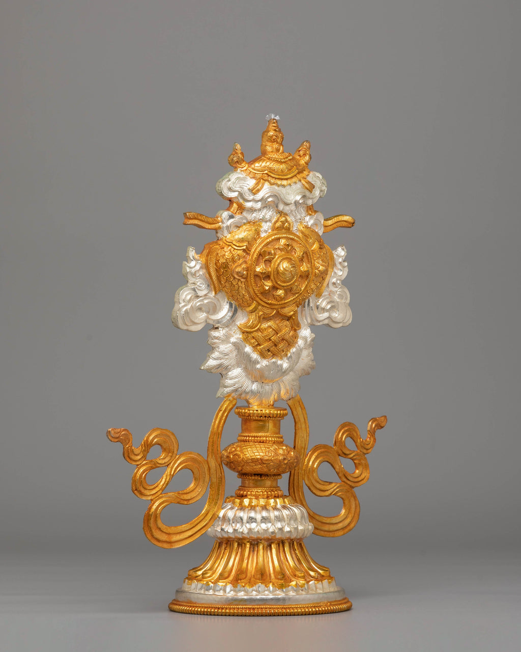 This Handmade Buddhist Ritual Auspicious Symbols Set is a stunning combination of copper, electro-silver plating, and electro-gold plating. It measures 32 cm in height and 24 cm in width, weighing 0.96 kg. This meticulously crafted piece embodies spiritual significance and cultural richness, making it a unique addition to any sacred space.