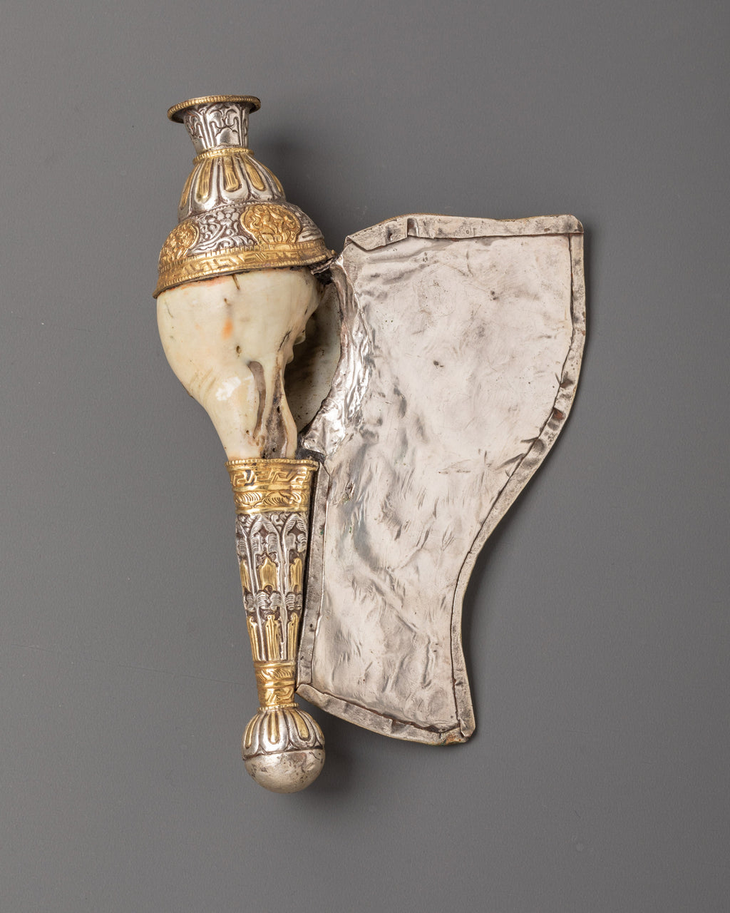 The Buddhist Ritual Conch is a sacred ceremonial instrument used in Tibetan Buddhist practices, symbolizing the spreading of the Buddha’s teachings. Measuring 21.5 cm in height and 14.5 cm in width, this exquisite conch is crafted from a natural conch shell, mounted in white copper alloy, and adorned with gold plating. Its elegant design combines traditional craftsmanship with spiritual symbolism, making it a meaningful addition to any Buddhist altar or meditation space.