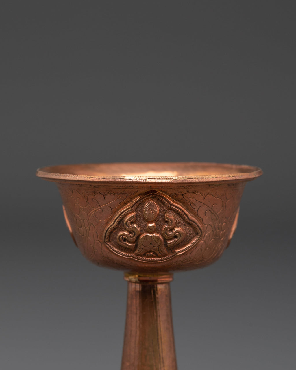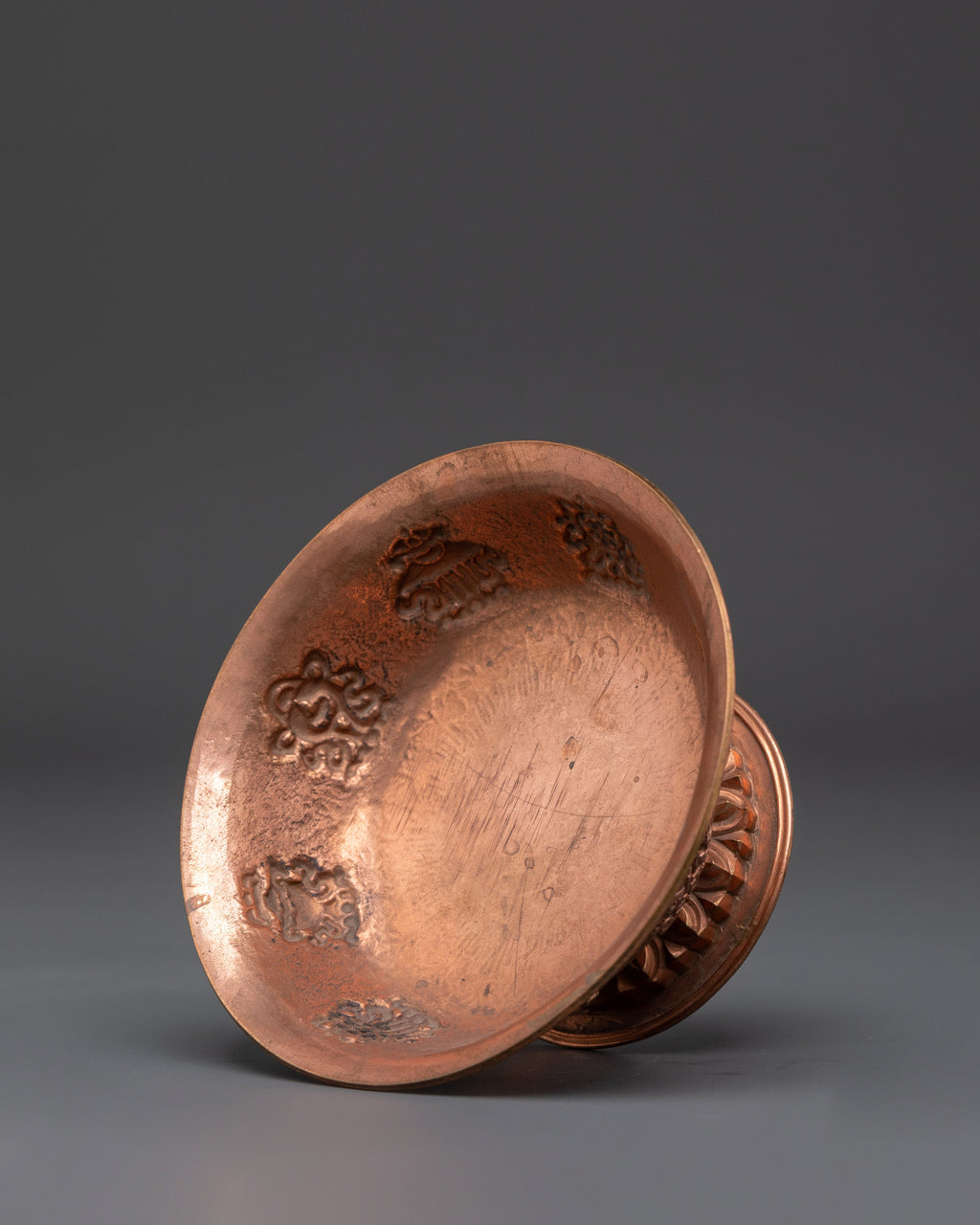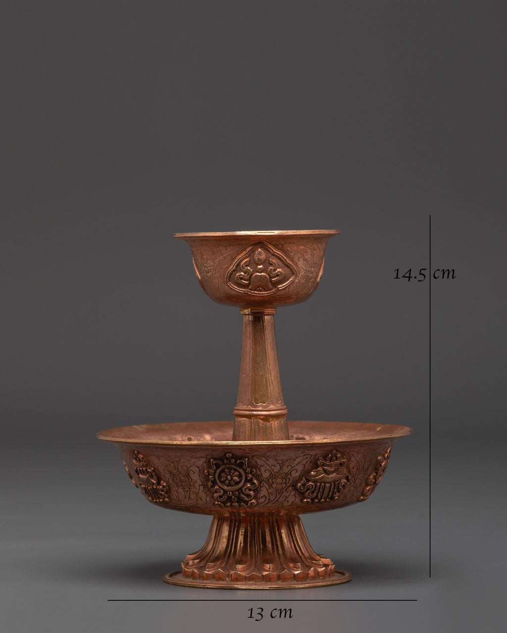 This exquisitely handcrafted Buddhist Serkyem Set is essential for anyone devoted to Tibetan spiritual traditions. Made from copper and standing 14.5 cm tall, this sacred offering bowl is traditionally used in Tibetan Buddhist rituals to present offerings. Its detailed design showcases classic Buddhist symbols, bringing a holy presence to your meditation area or shrine. Whether you collect spiritual artifacts or seek to deepen your meditation practice, this Serkyem set is crafted to support and enrich your spiritual path.