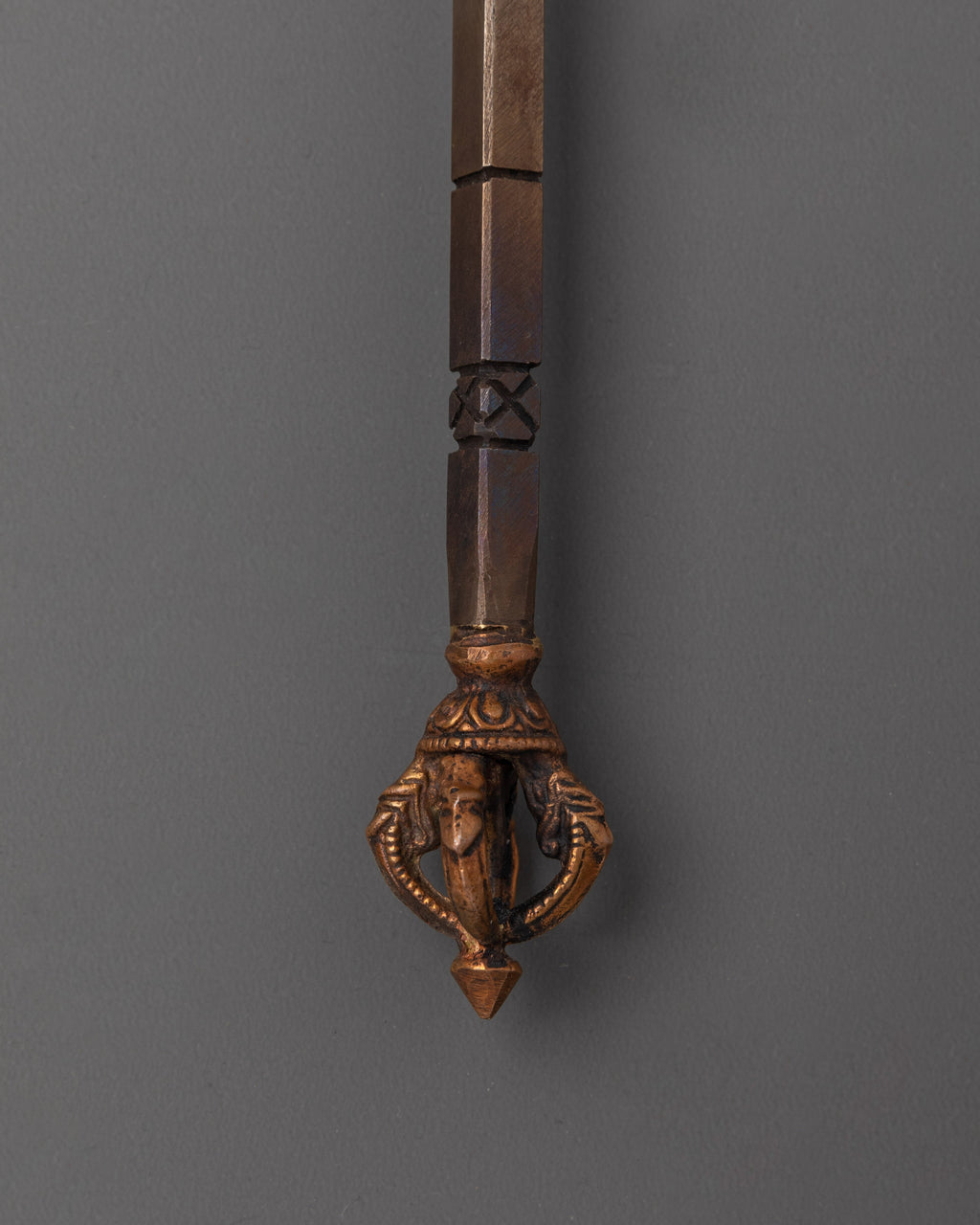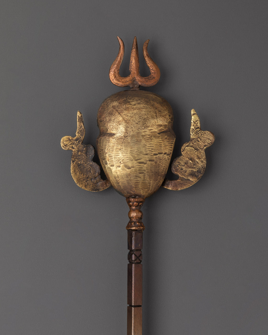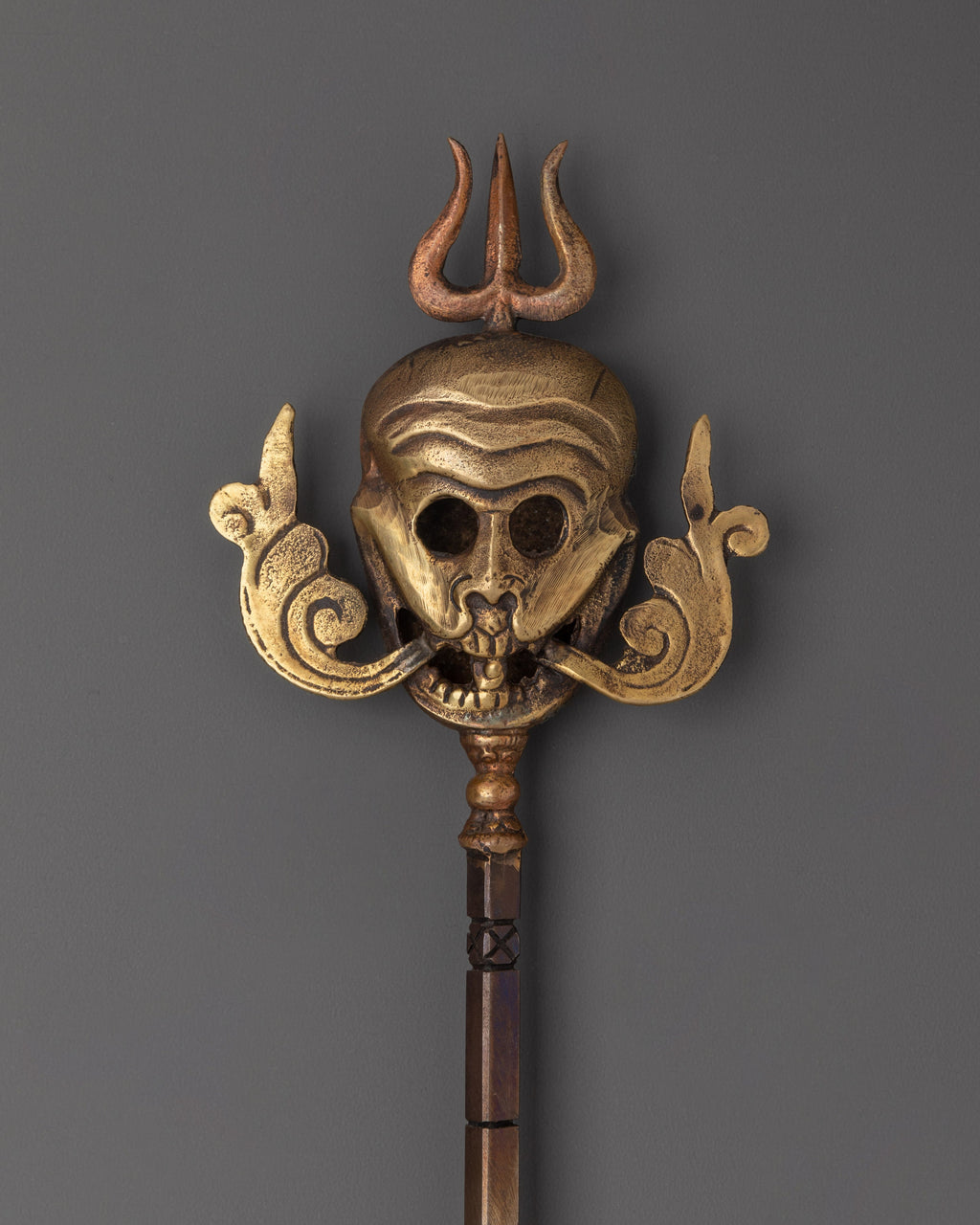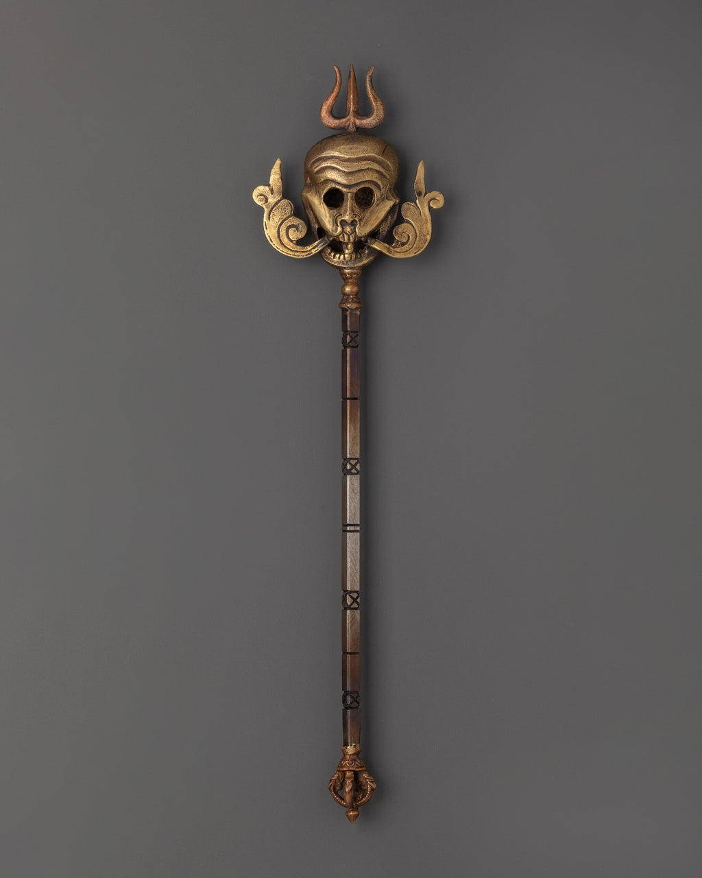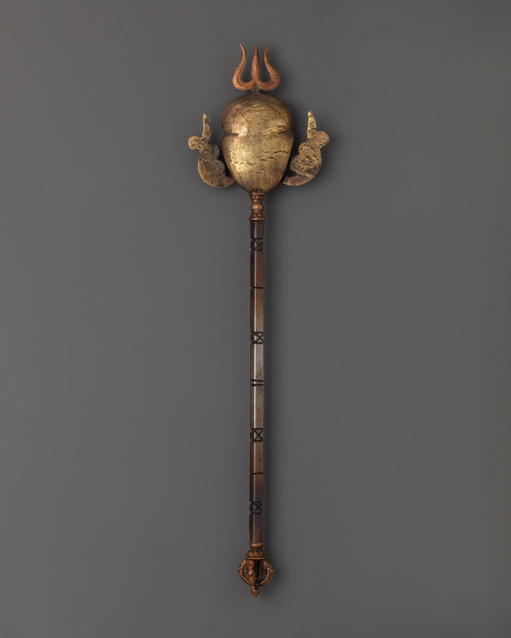 Khatvanga is a stick with a skull on top that is commonly used in Tantric rituals. It is also depicted in the hands of the oldest known Tantric pictures in the Indic world. It comprises a short stick topped by a single skull from which a vajra emerges.