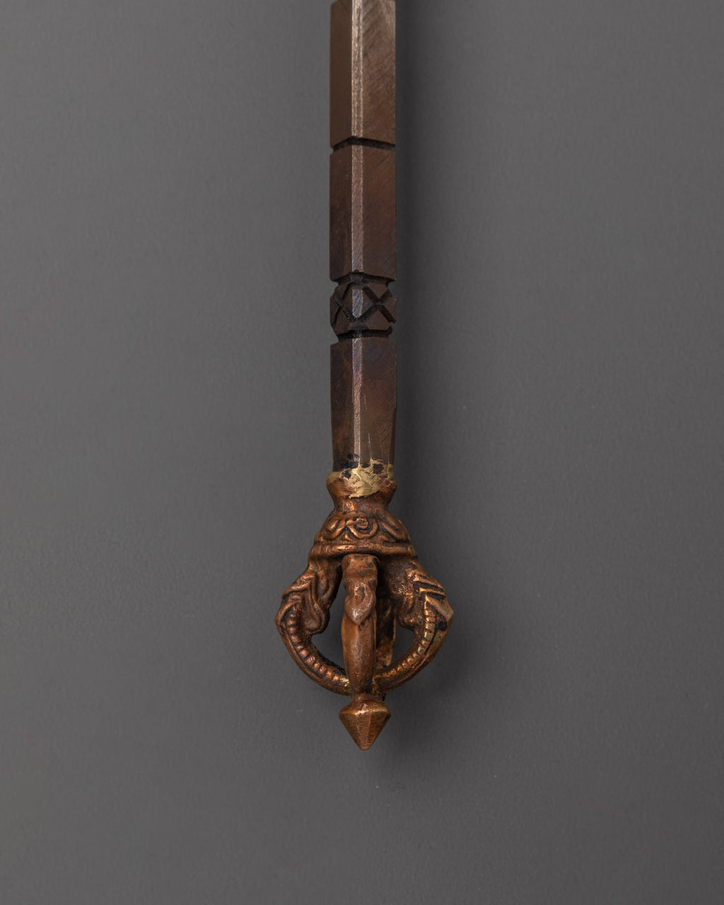 This Buddhist Shrine Khanvanga is a revered tantric ritual staff, rich in symbolism within Vajrayana Buddhism. Traditionally wielded by enlightened deities like Vajrayogini and Guru Rinpoche, the Khanvanga embodies the profound union of wisdom and compassion, serving as a potent emblem of spiritual protection. Measuring 44.5cm tall with an 11.5cm base and weighing 0.35kg, it is expertly crafted to enhance your altar, meditation practice, or Buddhist shrine. Incorporating this sacred staff into your spiritual space invites deepened focus, protection, and connection to timeless Vajrayana traditions, supporting your journey toward enlightenment.