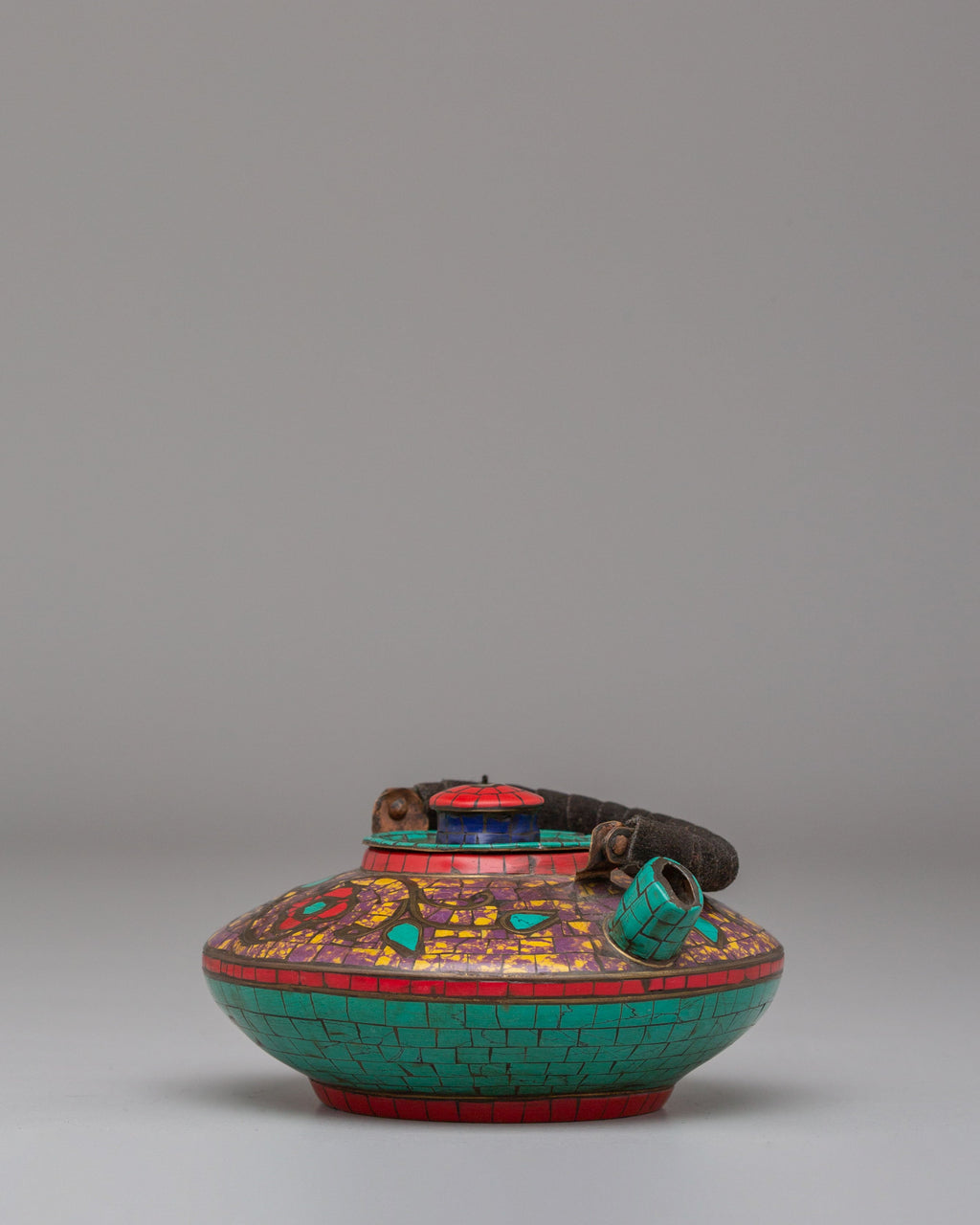This exquisite teapot is a perfect blend of craftsmanship and spiritual symbolism, featuring a unique combination of copper, coral red stone, lapis lazuli, and turquoise. Standing at 9.5 cm in height and 11.5 cm in width, this tea pot is not only functional but also a statement piece for your tea ceremonies or home decor. The combination of rich copper tones with the vibrant accents of coral red stone, lapis lazuli, and turquoise creates an appealing design, making this teapot an exceptional addition to any collection.