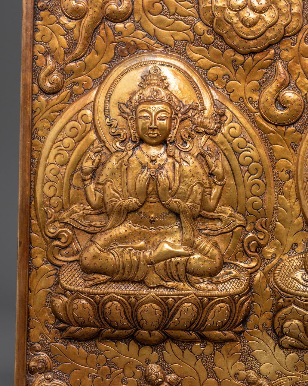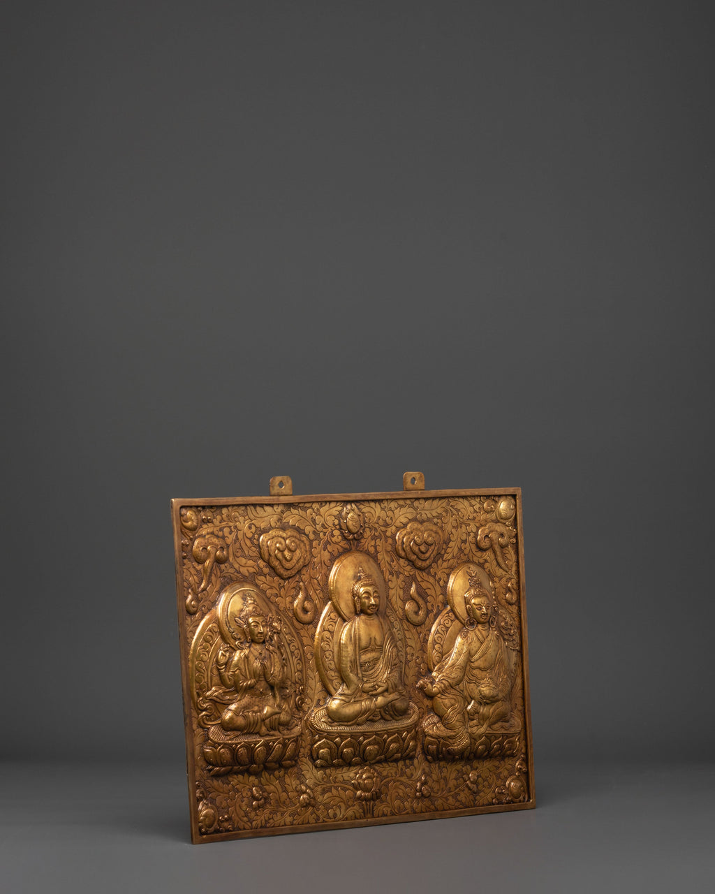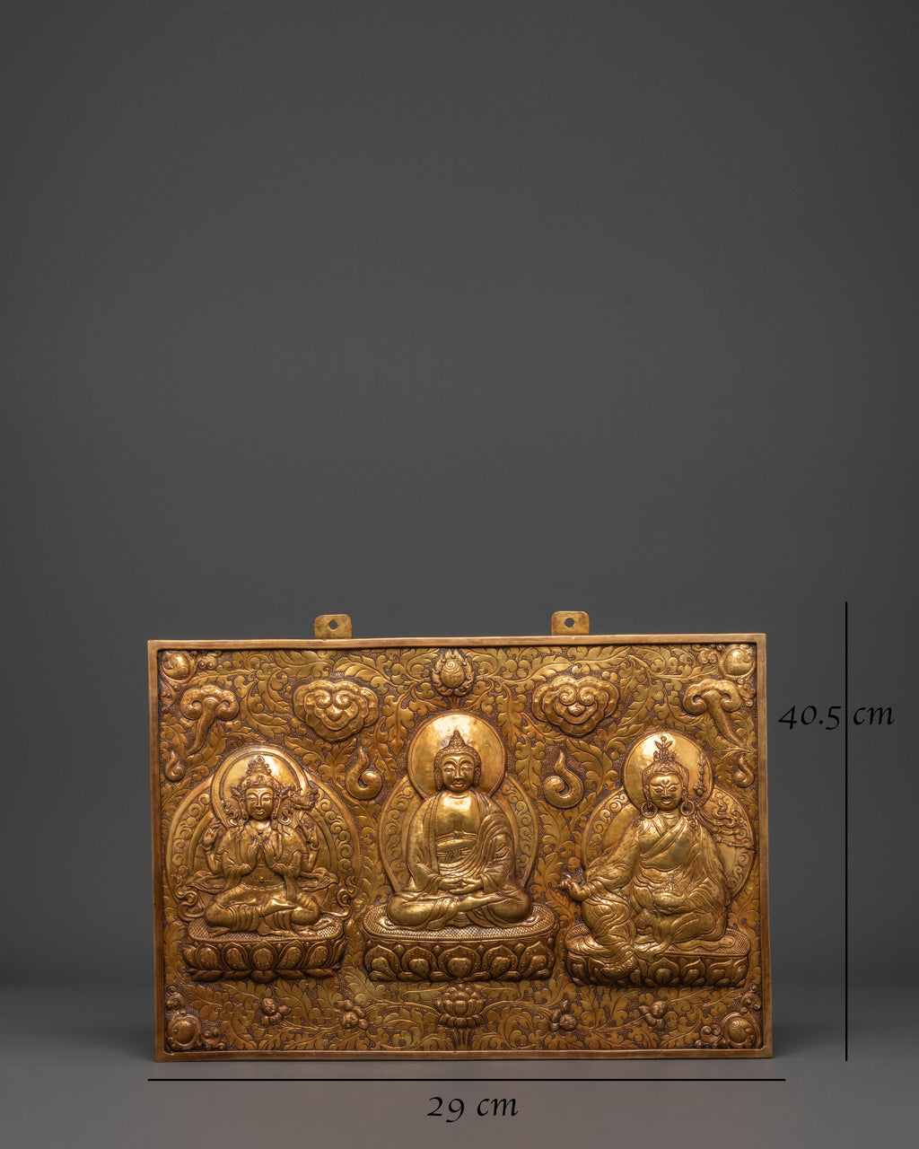 The intricate brass relief showcases each Buddha figure seated in meditation posture on lotus thrones, surrounded by elaborate floral motifs and traditional Tibetan cloud patterns. The central composition displays the three enlightened beings with their distinctive iconographic features: Guru Rinpoche with his characteristic hat and tantric implements, Chenrezig in his four-armed compassionate form, and Amitabha Buddha in serene meditation mudra. The ornate border features swirling vine patterns, sacred symbols, and decorative elements that frame the holy trinity, while the detailed metalwork creates depth and shadow that brings each figure to life. The handcrafted brass construction showcases traditional Himalayan artistic techniques passed down through generations of skilled artisans, with every detail carefully embossed to honor the sacred nature of these revered Buddhist masters.