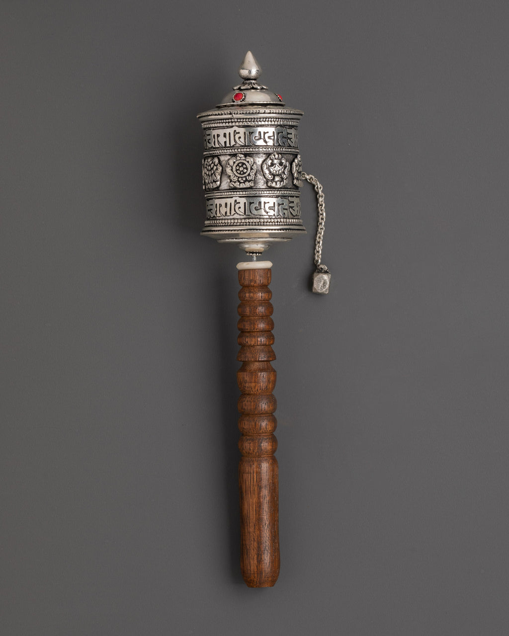The wheel showcases detailed Tibetan motifs and intricate carvings that reflect deep spiritual symbolism and artisanal mastery. The copper body emits a radiant warmth, complemented by brass embellishments and white metal patterns that accentuate its sacred charm. A touch of artificial coral stone adds a vibrant, traditional aesthetic. The finely turned wooden handle ensures comfort and balance, making it ideal for meditation sessions, daily rituals, or as a statement piece in your home shrine or altar.