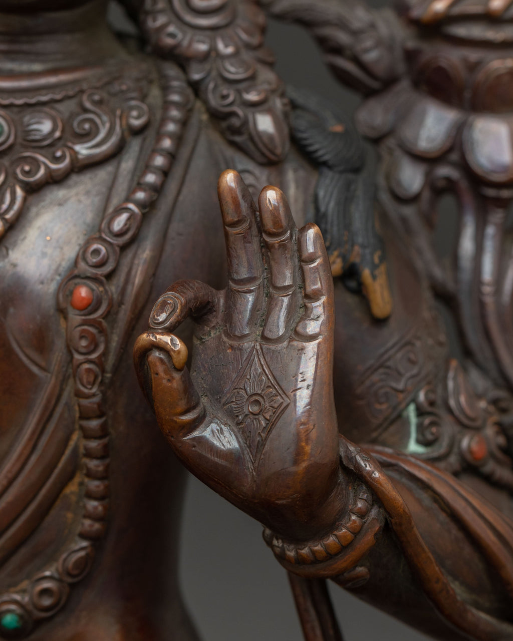 Materials: Oxidized Copper Body, Acrylic Paintings, Gemstones